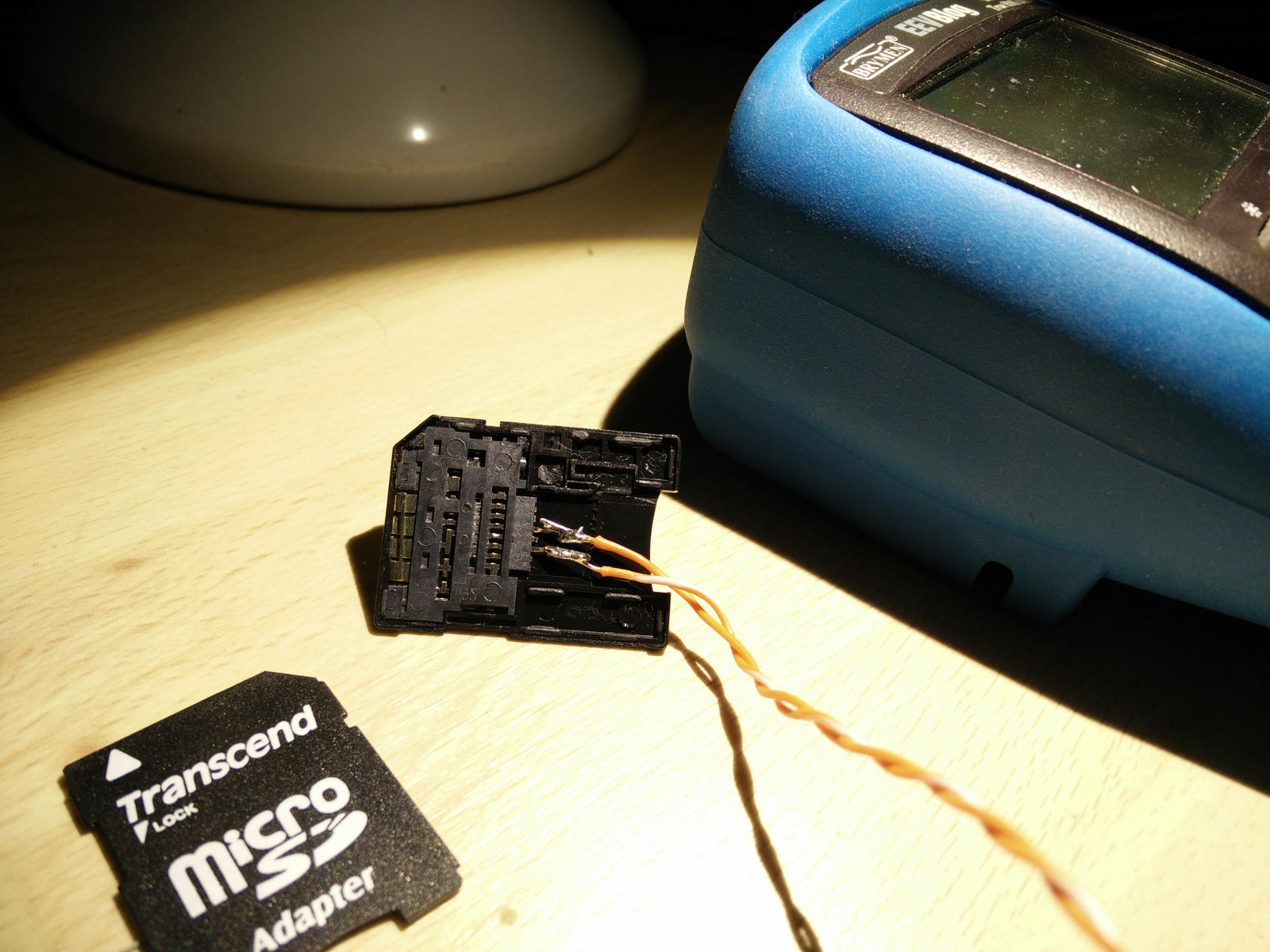 You can see that I cracked a micro SD card adapter, it’s easily done with a knife. Then I removed the pins I didn’t want to use as they’d only cause a short, and soldered my LED’s wires. I glued the lid back on with some hot glue, careful to properly isolate the pins.
