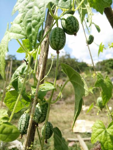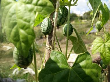 To get any meaningful harvest, make sure you plant as many as you can; one vine can bear maybe 10–15 fruits over the season, if you care for it well and are lucky, but they are tiny. The vines can be planted densely, as close as 15 cm together, despite what some articles about them claim. In my case the growth was in part horizontal, making a sort of bush at the base of the support structure. Some vines bravely climbed higher, but the bulk of the fruit has grown in the bottom half-metre. This could be improved with a the plastic net, or by trimming the side shoots.