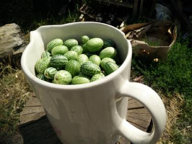 When to harvest the fruit? This sounds easy, but there is no clear indication that a cucamelon is ripe. Despite the name, they don’t turn red on the inside, they’re more like little cucumbers. The ourside also stays white-green all the way until they drop on the ground, at which point they’re over-ripe and not very good. A good rule is to let them hang on the vine until they’re about as big as a thumb (about 2.5 cm long, 1.5–2 cm in diameter). But this varies from plant to plant, also how much you water them, how much sunshine they get, etc.