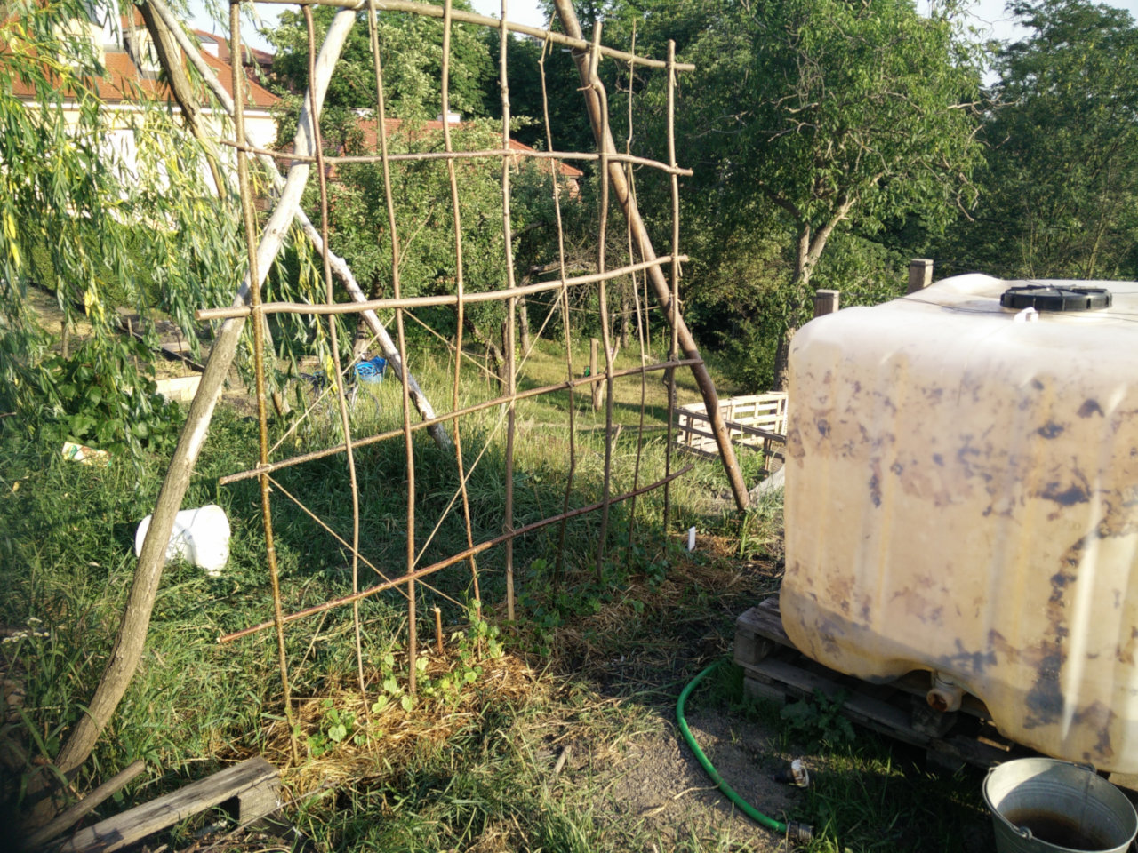 Cucamelons are climbing vines, and if you don’t give them good support, they will stay on the ground, making a big tangle. That’s not great for harvesting, and they’re also closer to hungry slugs and snails who have a real appetite for the fruits. I’ve built a mesh of sticks and string for them, but the sticks turned out to be too thick for the cucamelon tendrils, so I added more string all over the place. They love climbing on it. Next year I plan to use a proper plastic net instead, that should work much better.