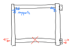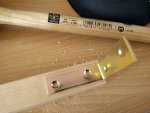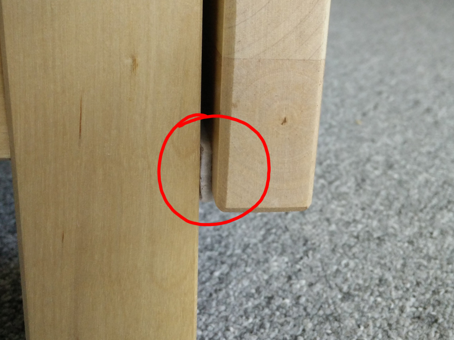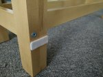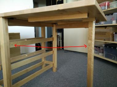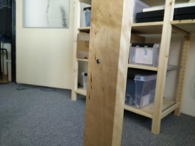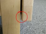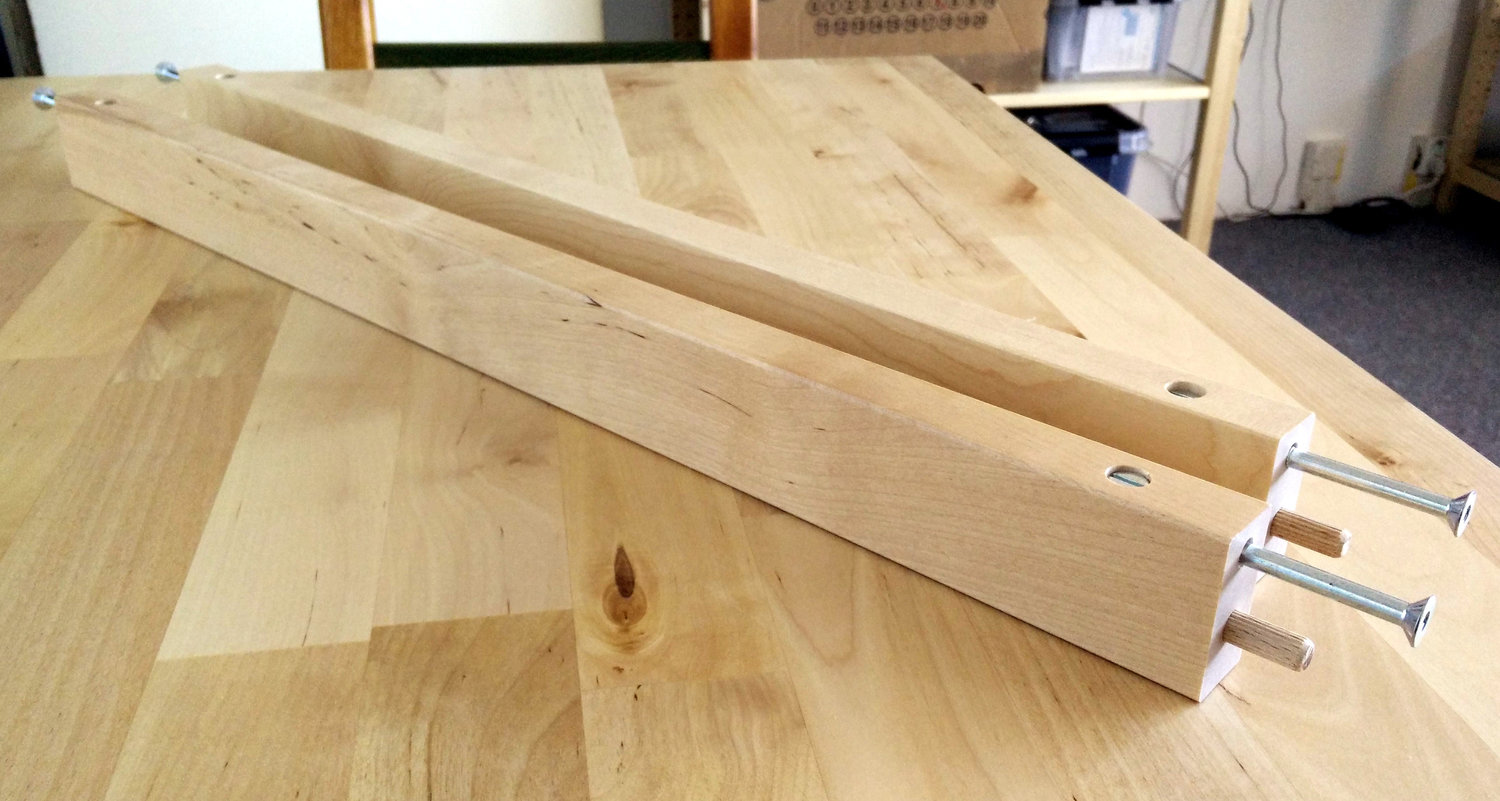 My first attempt at fixing the stability issue was by gluing the wooden pins that hold the leg structure together. That helped, but wasn’t quite satisfactory, because the wood of the pins still has a lot of flexibility–too much, as it turned out. The leg still kept bending and twisting, just less so. You can do this with a lot of strong glue, if you don’t feel up to the more complicated fix described below. Just keep in mind that removing a glued pin (and thus disassembling the leg structure, e.g. to apply the better fix) is impossible without breaking the pins and then drilling their remains away. It’s not that hard, but still sucks.