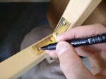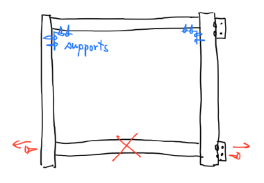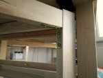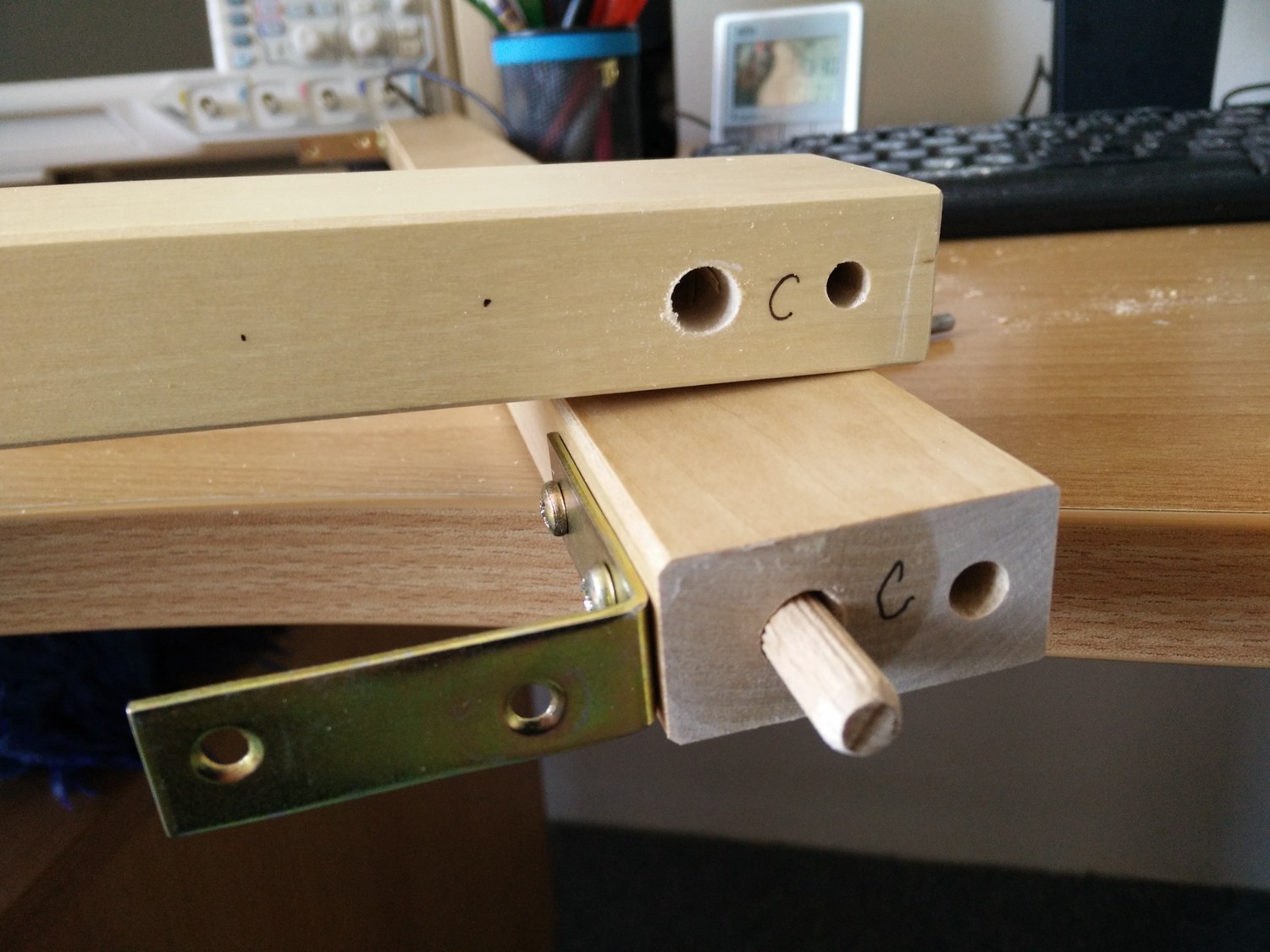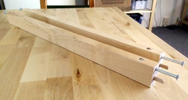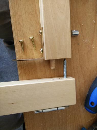 After you’ve attached both connectors to the top beam, connect the side beams (the leg and the one with hinges) using the original long screws and nuts. Place the whole thing on sone good flat surface (the backside of the table desk works fine) and verify that everything is straight. You can lightly twist the leg up or down to fix any issues. Mark the drill hole positions on the side beams through holes in the connectors, then take it apart and pre-drill these holes as well.