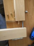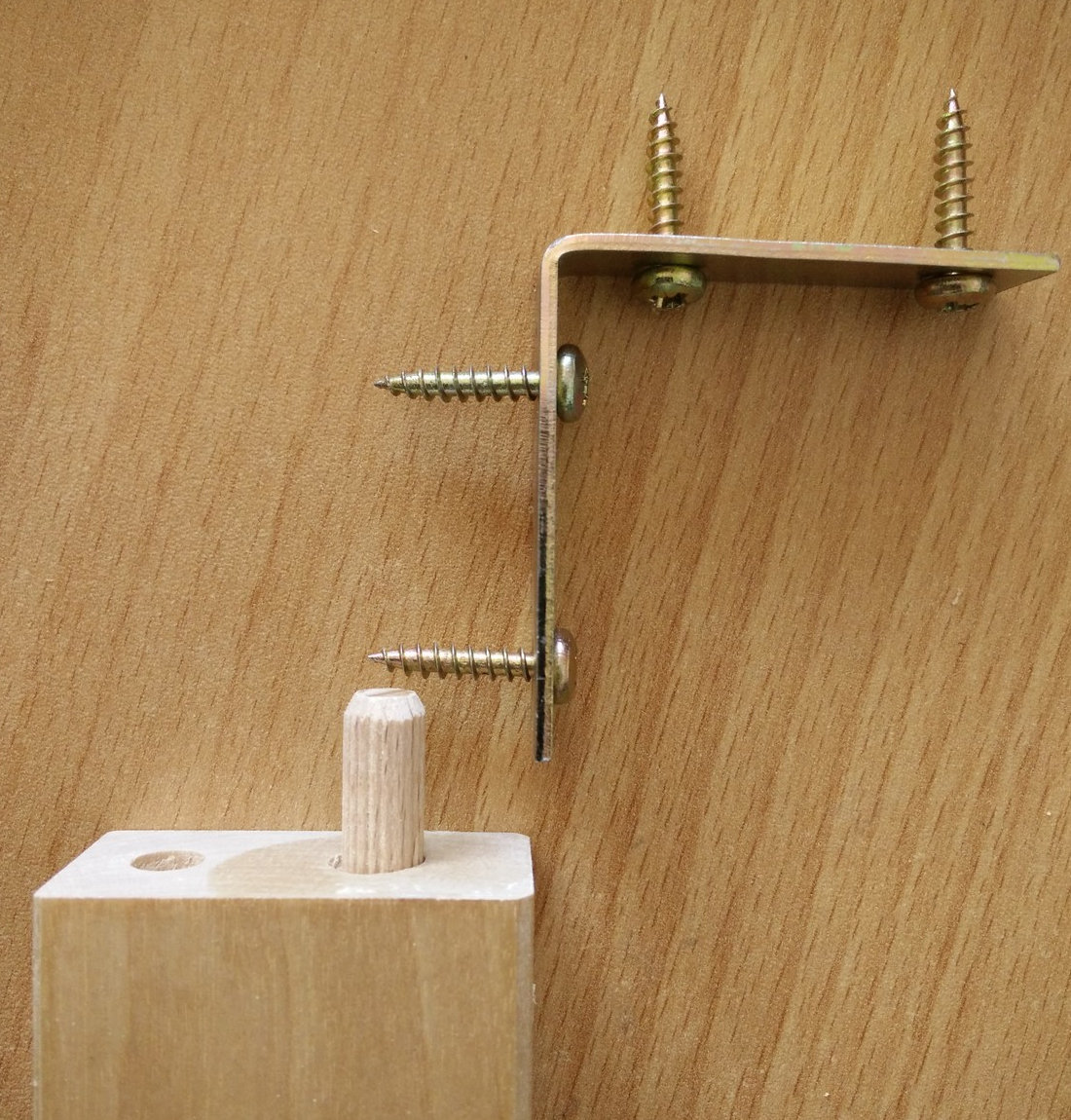 Note that the outer guide hole (and the screw) may cross the wooden pin. That’s okay, if anything it strenghtens the joint. Just make sure you put the pin in the hole before screwing the connector onto the beam.