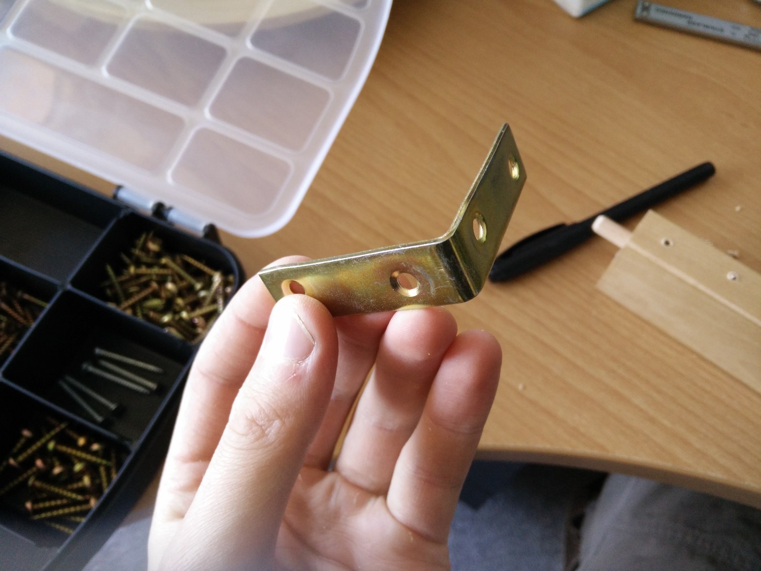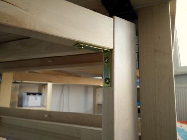 Place the angle connector on the top beam in the position where you want to screw it on. Make sure it’s well aligned and reaches just to the end of the beam. Mark the screw holes, remove the connector, and drill your guide holes. It is a hard wood, drilling will go slowly and the drill bit will get hot. Keep a right angle! Also don’t break your drill bit inside the wood, it’d be almost impossible to take out. This is why we’re pre-drilling the holes, too: breaking a screw in a wood like this is basically unfixable.