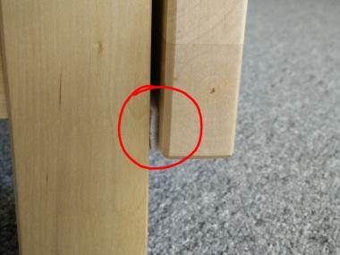 Could we remove the bottom beam? It’s a part of the pre-assembled piece, but it’s only screwed on, so taking it out is quite straightforward. What’s less straightforward is how to give the table its stability back after you removed this important part of the structure. Note how the leg now hangs on a single screw and a wooden pin that’s not even glued in place. Worse, the other end of the top beam is attached in exactly the same way, making the stability even worse. The leg keeps bending when you hit it by accidnet, when you open or fold it, etc. It’s just useless without the support of the bottom beam.