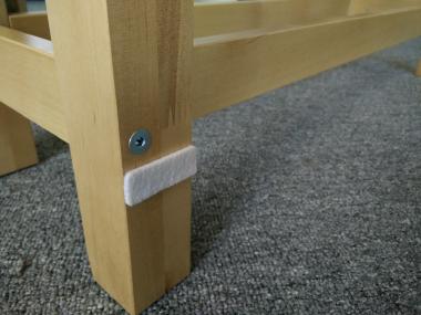Unscrew the top and bottom beams of the leg part and take it apart; a rubber mallet can help here. Again, store the screws (and the nuts in this case) safely. Put the bottom beam away, you won’t need it anymore. It’s identical to the top beam in case you mess something up and need a backup.