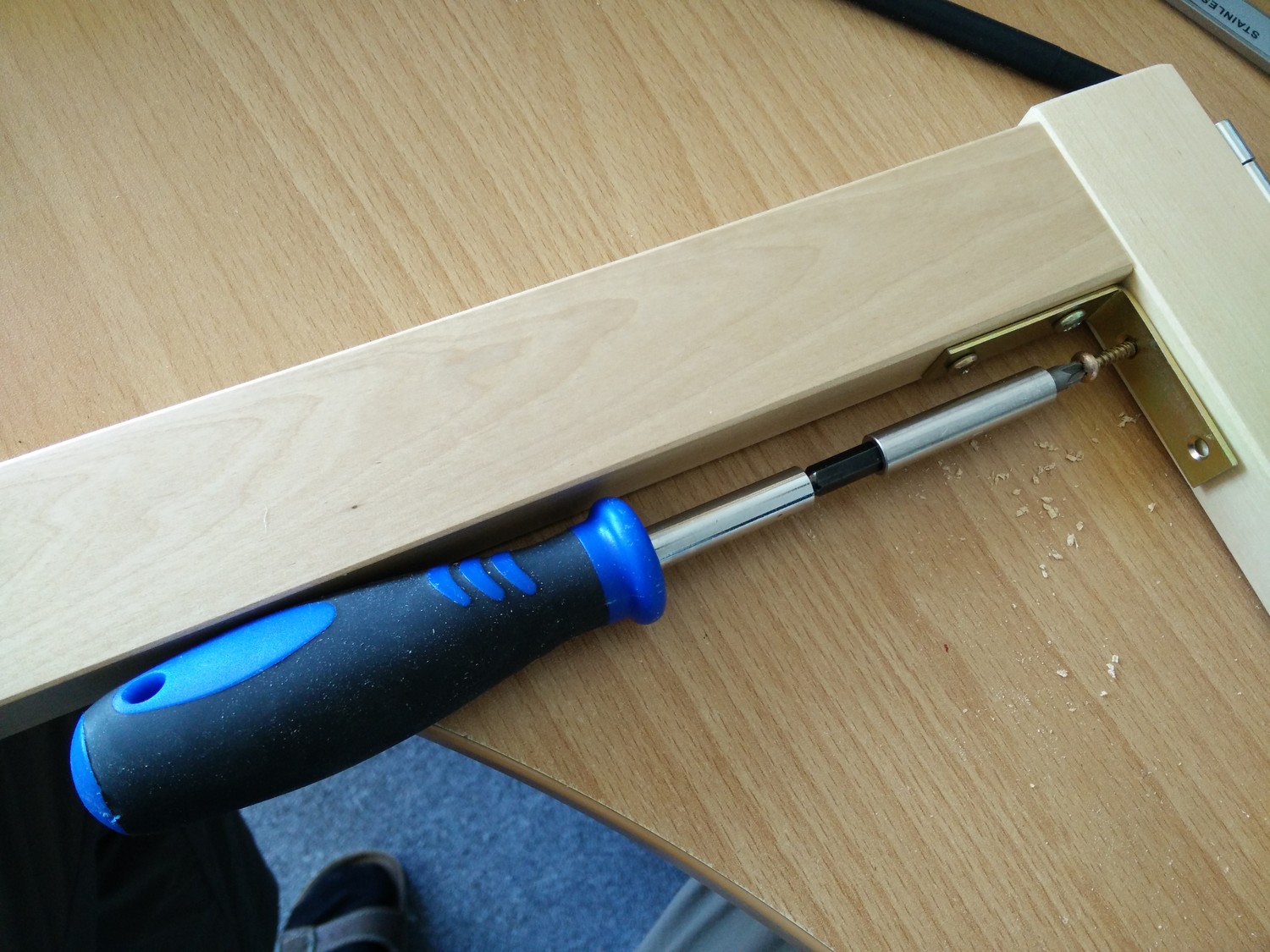Putting the connector screws in may be a bit tricky, because there’sa not much space. I found that you can use a bit extension adapter for this and the screwdriver handle can then be a bit thicker and it still connects fine, with the adapter acting as a sort of hinge. YMMW. Just get the screws in and tighten them well. Again, verify that the leg piece is perfectly straight. Don’t forget to also tighten the big screws, they’re still very important. Since the connector screws usually have some leeway, you can loosen them and adjust the leg’s inclination if needed, then fix it by tightening them.