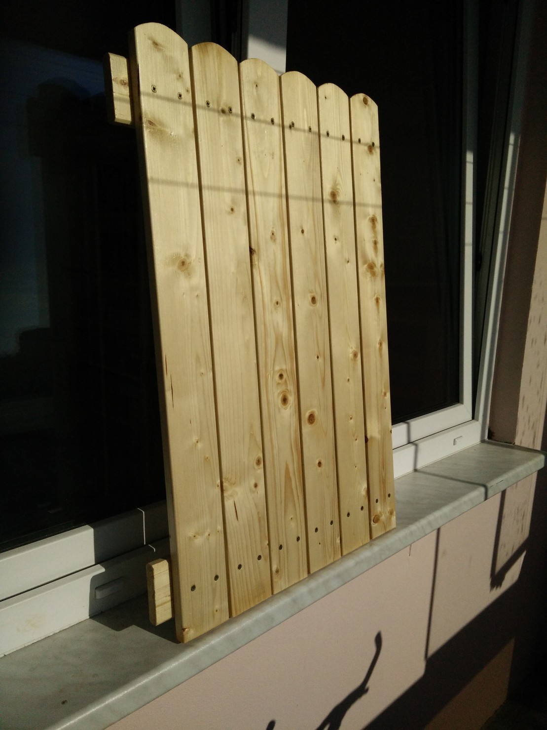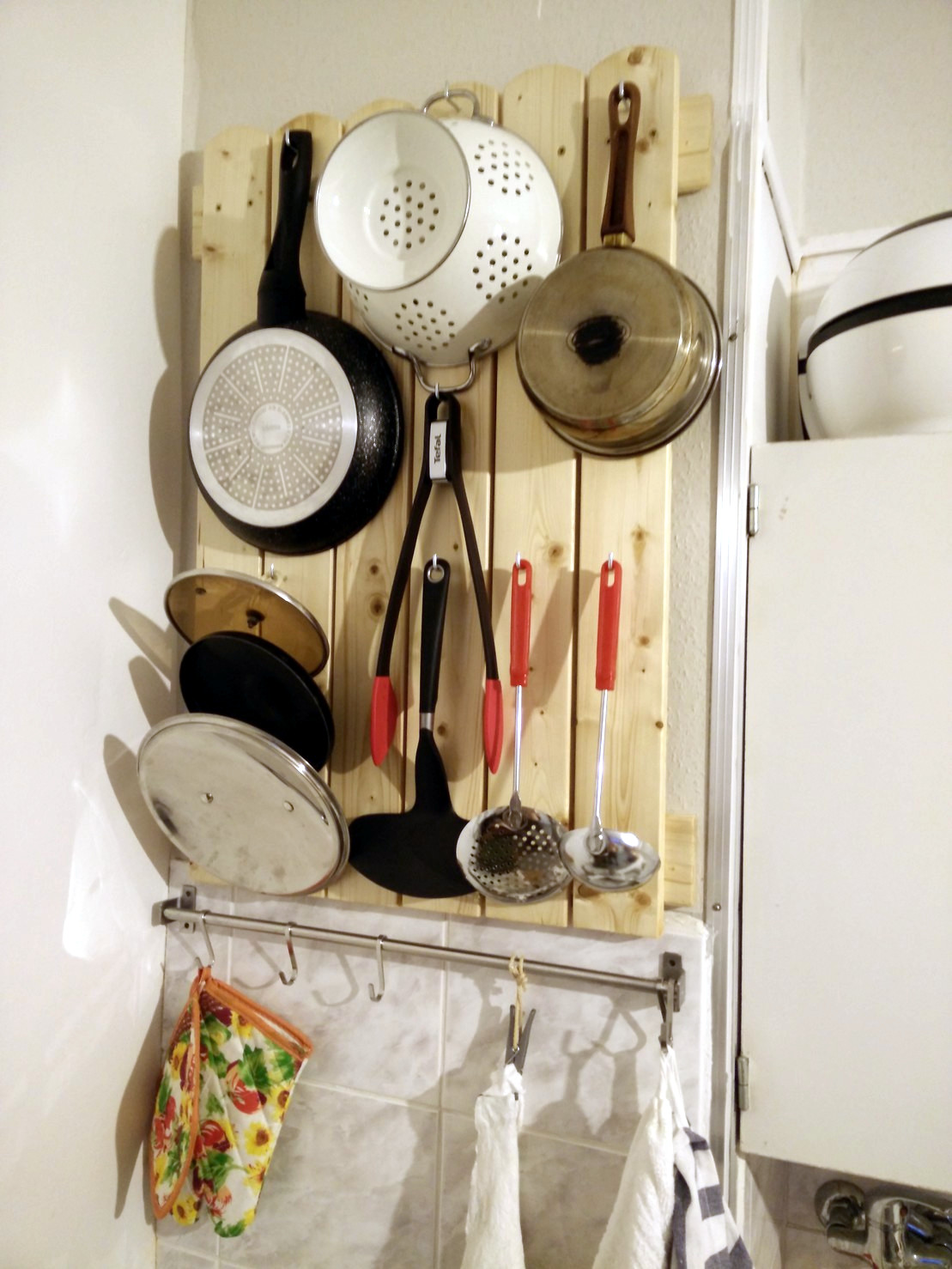 I bought some planks, gave them a good double layer of transparent varnish, and furnished them with screw-in hooks. Voilà…