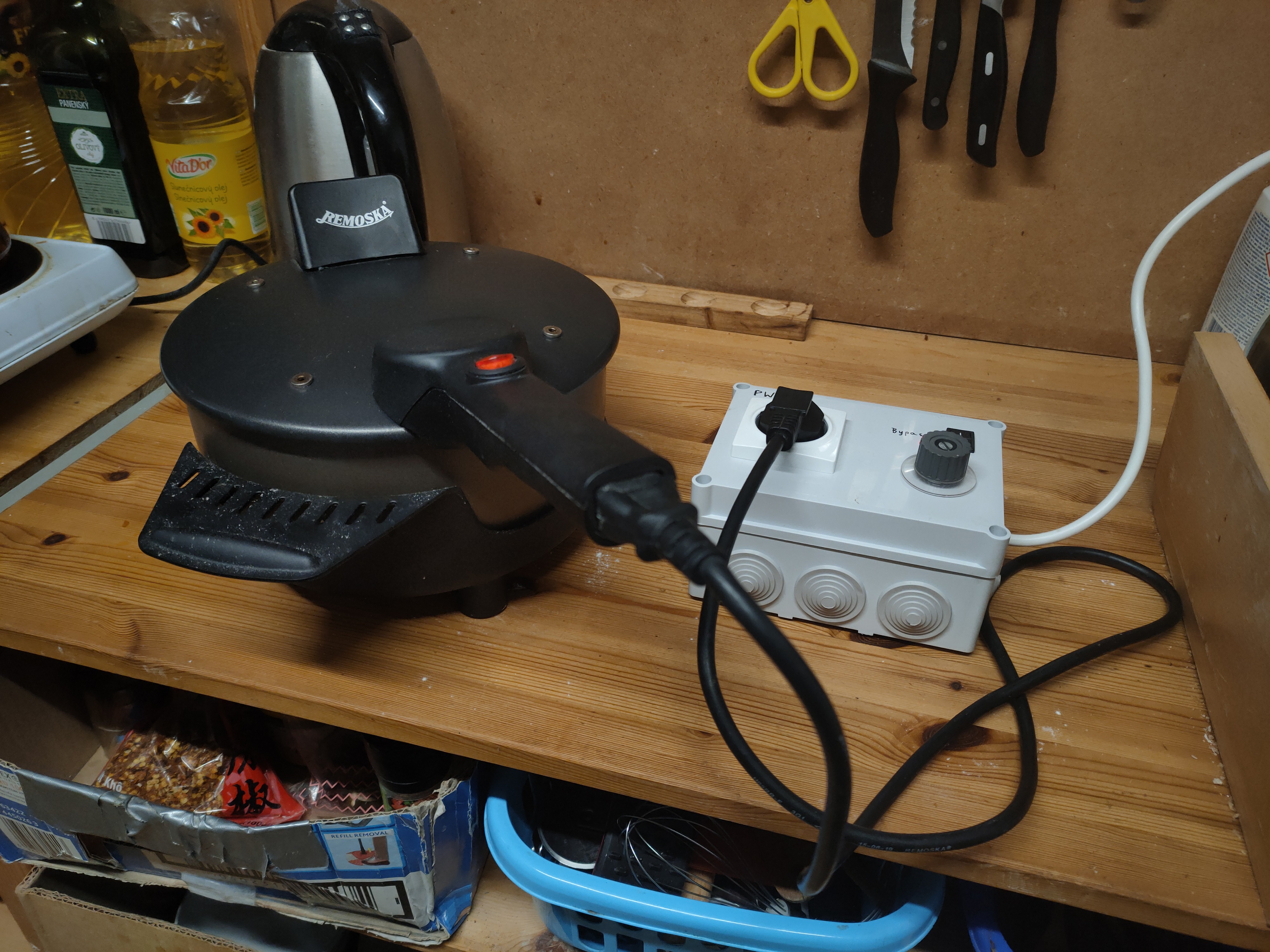 Díky tomu, že remoska používá odporové topné těleso s poměrně pomalou odezvou, úplně postačí pomalá regulace pomocí PWM. Střída je efektně znázorněna blikající LED i přímo doutnavkou na vypínači. Klasický triakový regulátor, jaký se používal k vrtačce, by pochopitelně také fungoval.