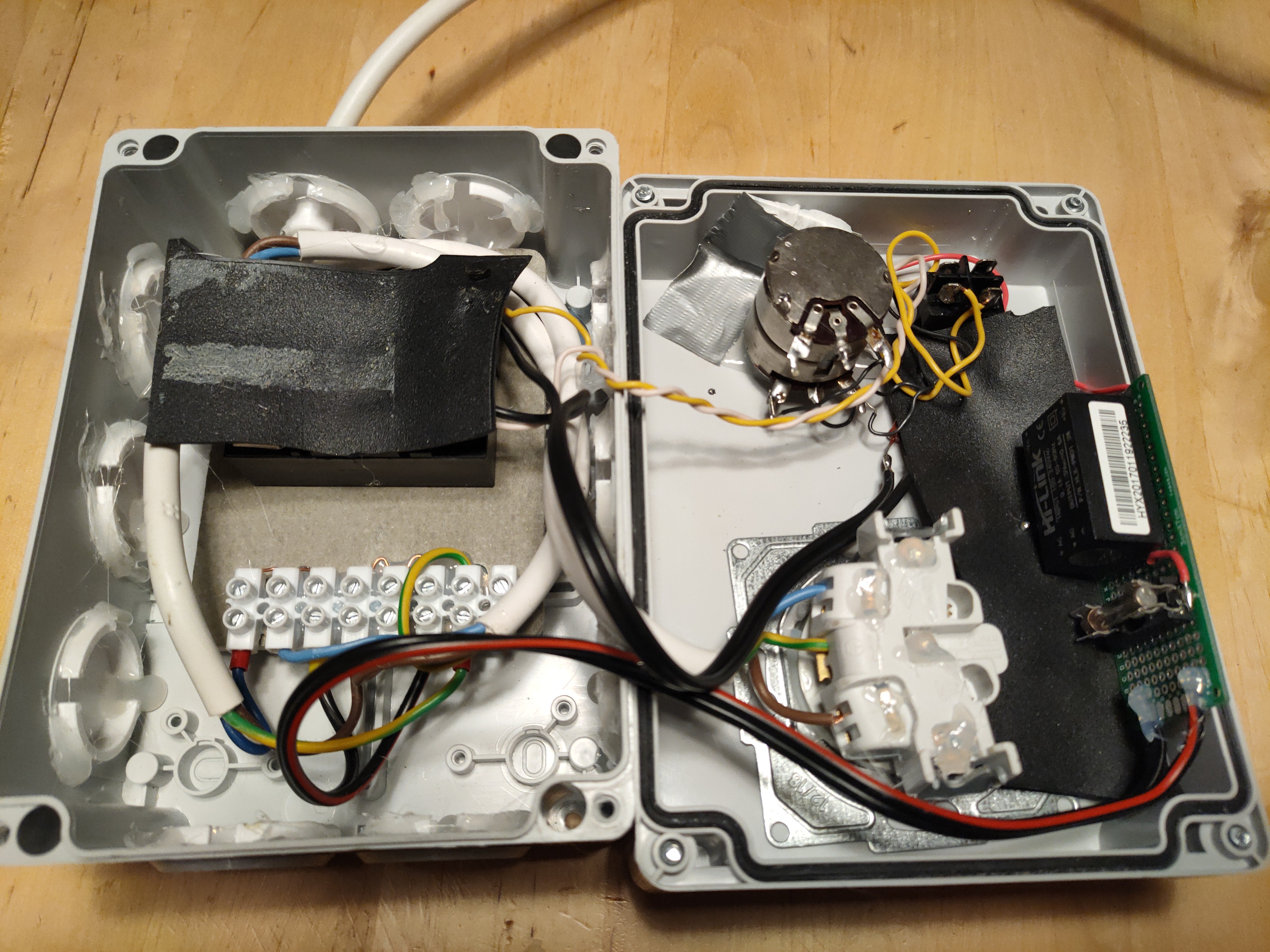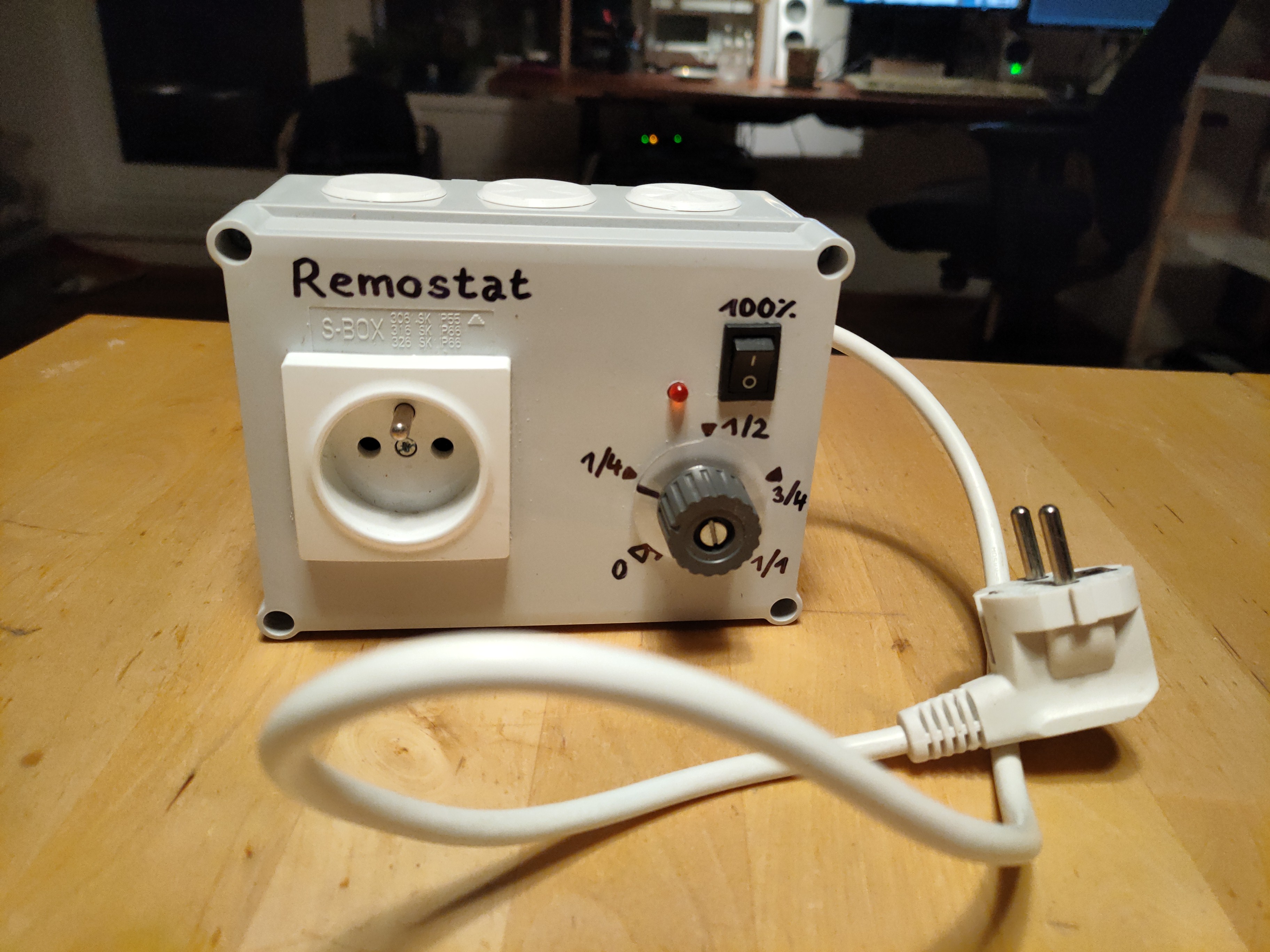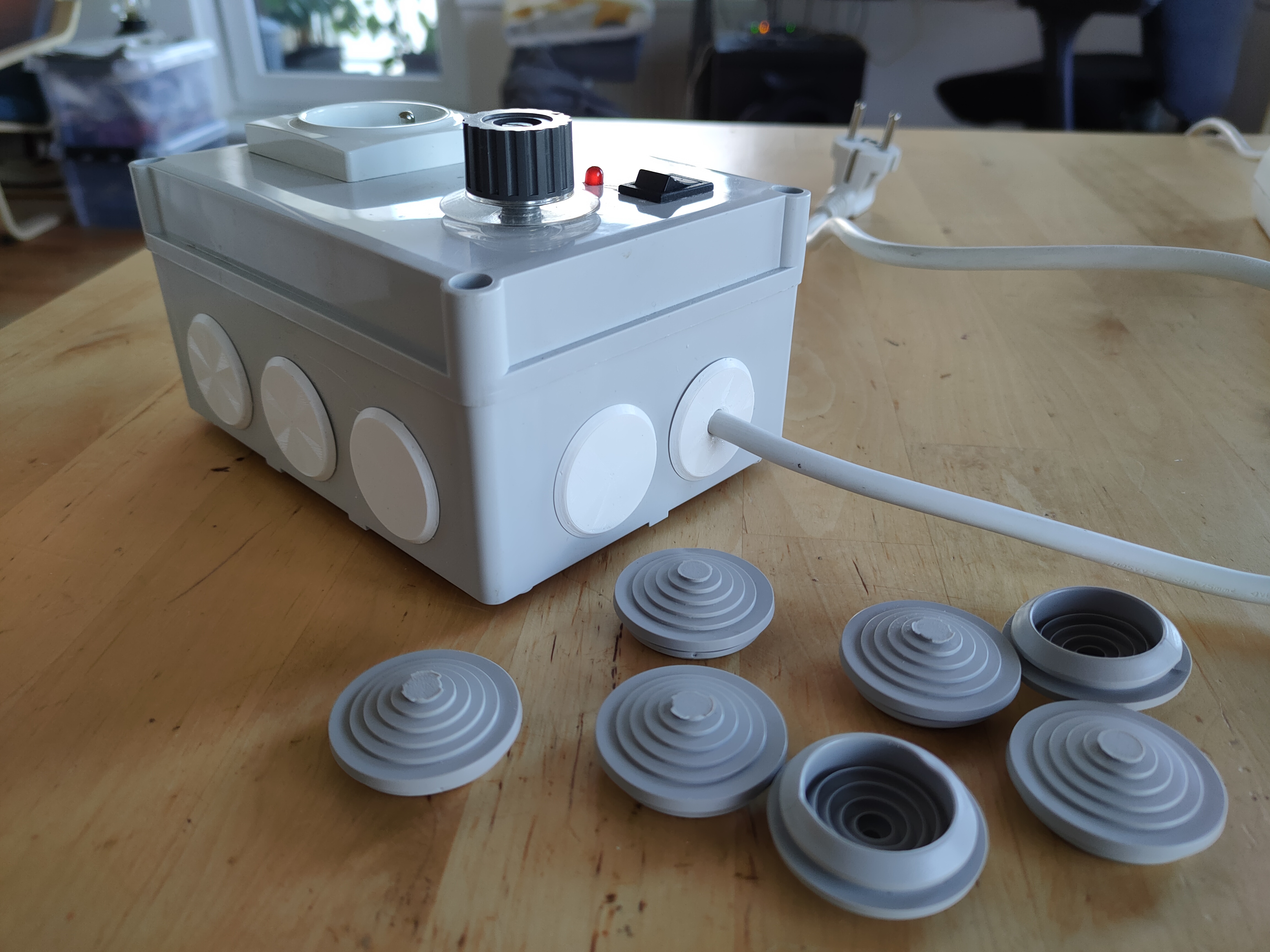 Zařízení je zabudované do instalační krabice se zásuvkou, bypass vypínačem (umožňuje dva režimy, plný výkon a teplota dle nastavení), potenciometrem s knoflíkem, a červenou LED, která bliká v rytmu PWM. Gumové záslepky jsem nahradil hezčími, vytištěnými na 3D tiskárně.