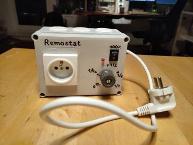 Remostat je regulátor výkonu remosky. Remoska, v žádné verzi, nemá nastavitelný výkon, jediná regulace spočívá v PTC efektu topného tělesa. Většinou to stačí, ale když peču chleba a hodně vyběhne, vršek má tendenci se připalovat. Díky remostatu můžu po prvních cca 20 minutách výkon ubrat na 3/4 až 1/2 a nechat chleba pozvolna dopéct. Regulace výkonu se uplatní i při jiných receptech, např. u zapečené zeleniny, francouzských brambor atd.