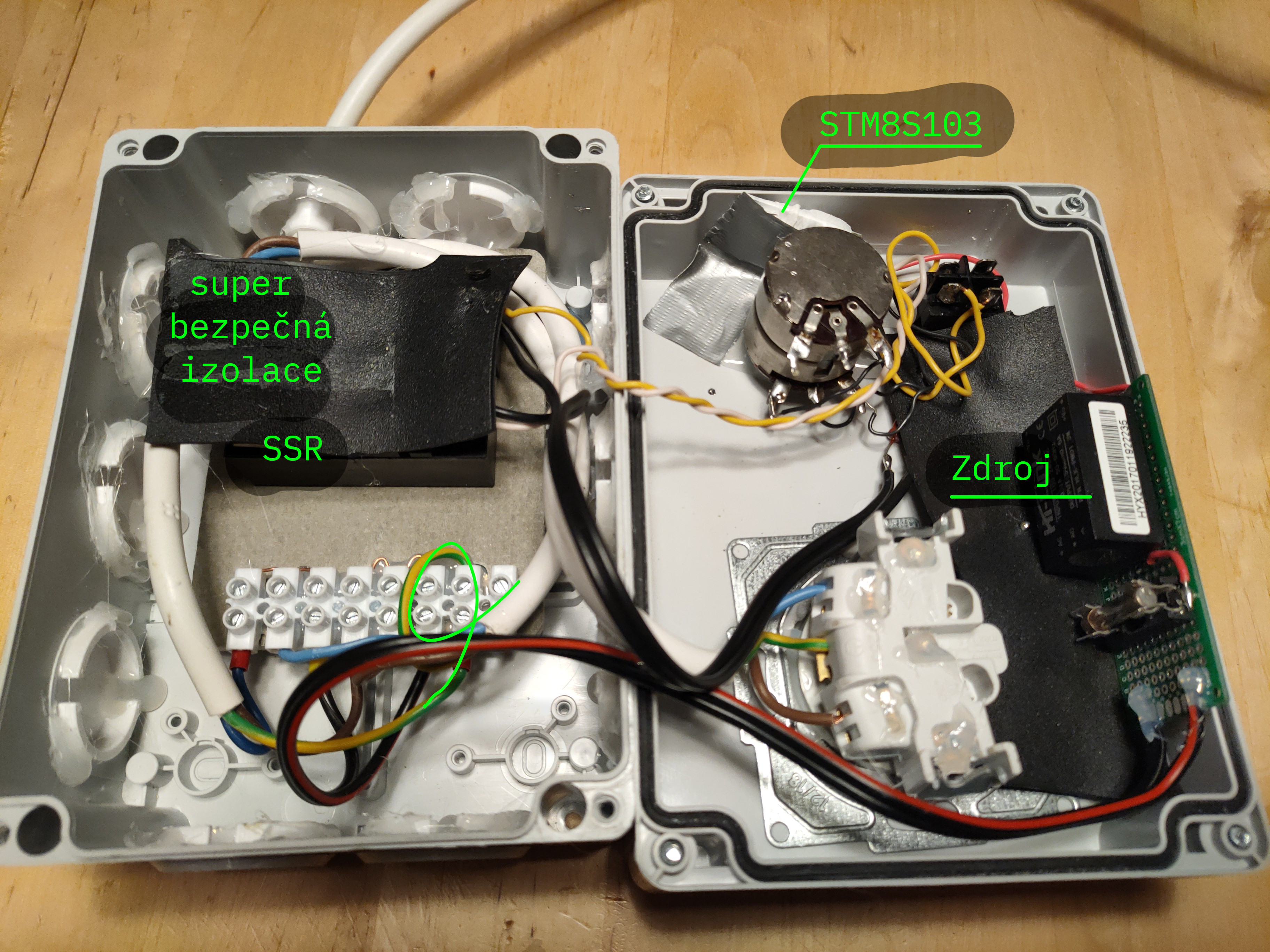 Moje první verze remostatu používala klasický 555 s potenciometrem, který spínal SSR, ale obvod nebyl úplně spolehlivý. Nová vylepšená verze vypadá zvenčí stejně, ale obsahuje STM8S103. Je to kanén na vrabce, ale tyto moduly jsou velmi levné a na podobně jednoduché projekty přímo stavěné. STM8S103 má ADC a PWM, nic víc není potřeba. Napájení je řešeno čínským modulem Hi-Link s pojistkou.