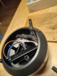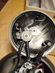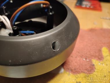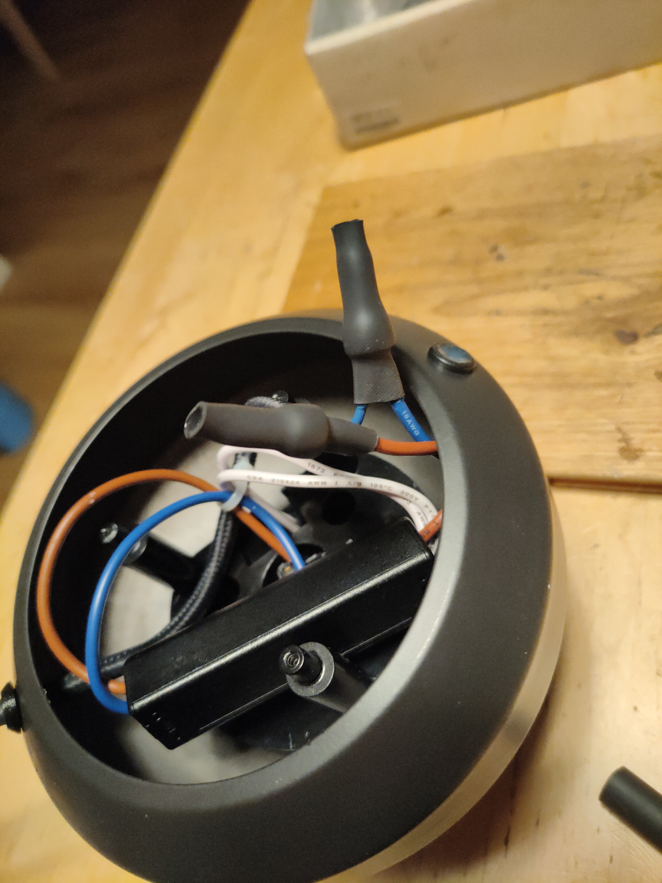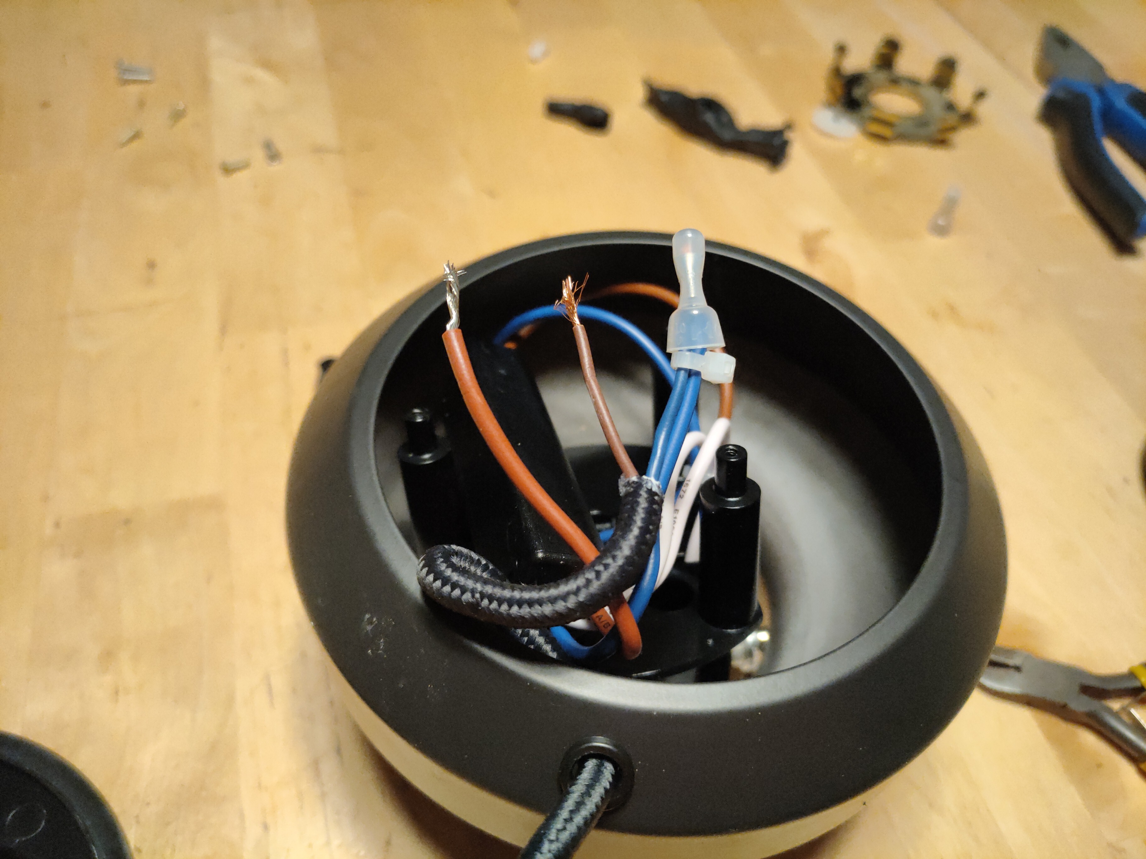 I decided to move the knob to the other side. The knob can’t really be moved, I didn’t even figure out how to detach it, but you can easily move the power cord instead. Einstein would approve. It’s really simple, all it takes is to drill a new hole. No soldering needed - the cables are connected by crimp caps that can be re-used (with some luck). If you press them with pliers from the right side, the cap opens again. Just don’t do it too many times or the metal will crack.