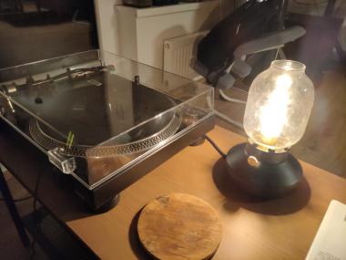 The IKEA lamp “TÄRNABY” with the vintage style bulb is really nice when you want to build cozy atmosphere. The design is based on classic kerosene lamps and there’s even a dimmer knob simulating wick length adjustment—just without the stench and soot.