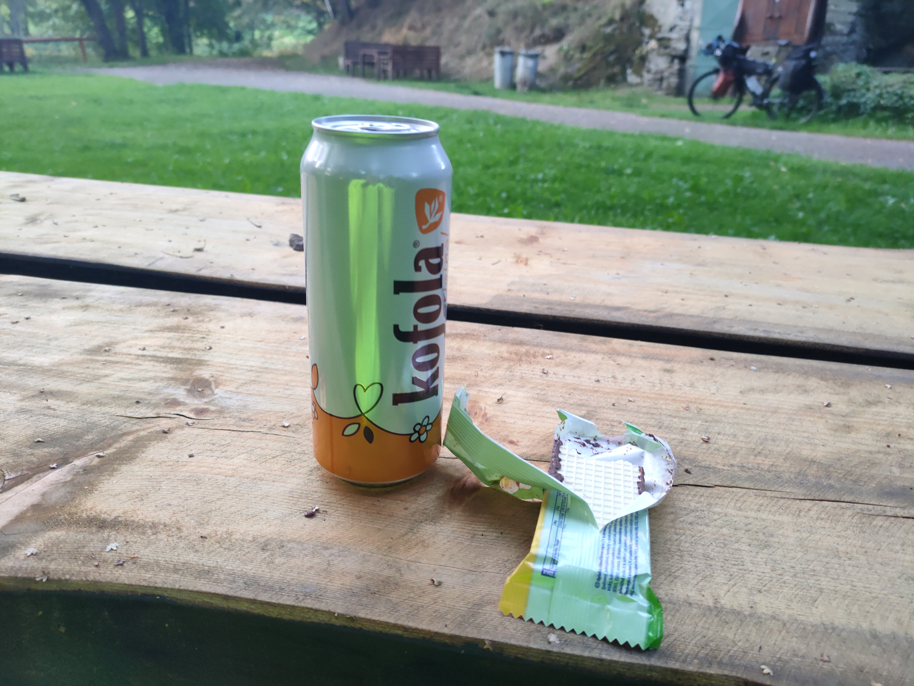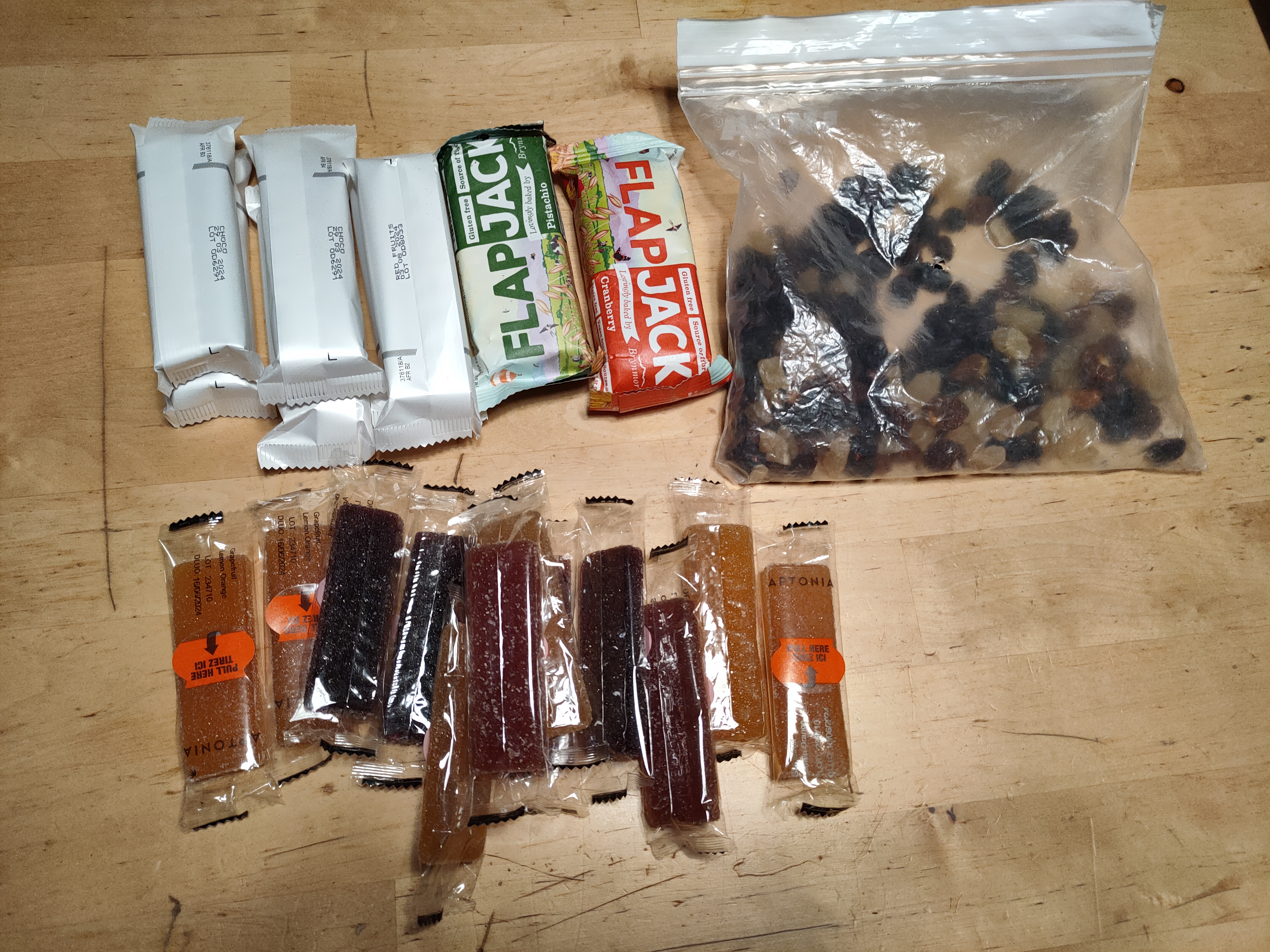 Co se týče zásob jídla, měl jsem několik instantních polévek k večeři, jedno balení malých čokoládových mysli tyček z Decathlonu, které se mi už osvědčily při výletu na Lipno, a jedno balení ovocných želé tyčinek odtamtéž (tyto se velmi osvědčily jako zdroj cukru v dlouhých stoupáních, nejlepší jsou hruškové a citrusové, jahoda je pěkně chemická). Obědy jsem plánoval ulovit po cestě a pro případ nouze jsem měl dvě plechovky tuňákového salátu Rio Mare. Na první dvě snídaně jsem měl kus hruškového koláče v alobalu, na další pak instantní rýžovou kaši. K tomu ještě zásobu sušeného ovoce, hlavně rozinky a brusinky se zázvorem. Vařil jsem na plynu z kartuše Coleman.