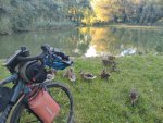 Cesta pokračuje dál přes Slaný směrem k Lounům. Ty si chci projet za světla a tak s přicházejícím soumrakem hledám místo k přenocování. Podle mapy ve vsi Citoliby odbočuji doprava k jakémusi architektonicky významnému mostu, kde mapa slibuje les. Most sice není nijak zajímavý, ale je u něj rybníček s kachnami a pěkné odpočívadlo, kde si ještě za světla vařím polívku. Sláva dotačnímu programu na rozvoj venkova. Kachny by si něco daly, ale musí se zatím spokojit s travou. V lesíku, který tu skutečně je, scházím z cesty a vážu hamaku. Kromě jednoho pejskaře o mě snad nikdo neví.
