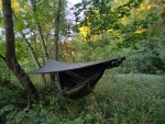 Hamaka je typ Hennessy Explorer Deluxe Zip XL, underquilt DD Hammocks Underblanket. Underquilt na tuhle hamaku nepasuje úplně dobře (to ale asi žádný, protože Hennessy má asymetrický tvar a je to spíš takový levitující stan než klasická hamaka). Musel jsem přidat poutka na lepší místa a stále řeším jak UQ k hamace rozumně připnout. Gumové tkaničky fungují, ale hamaka se tím trochu deformuje a přilnutí není moc dobré.