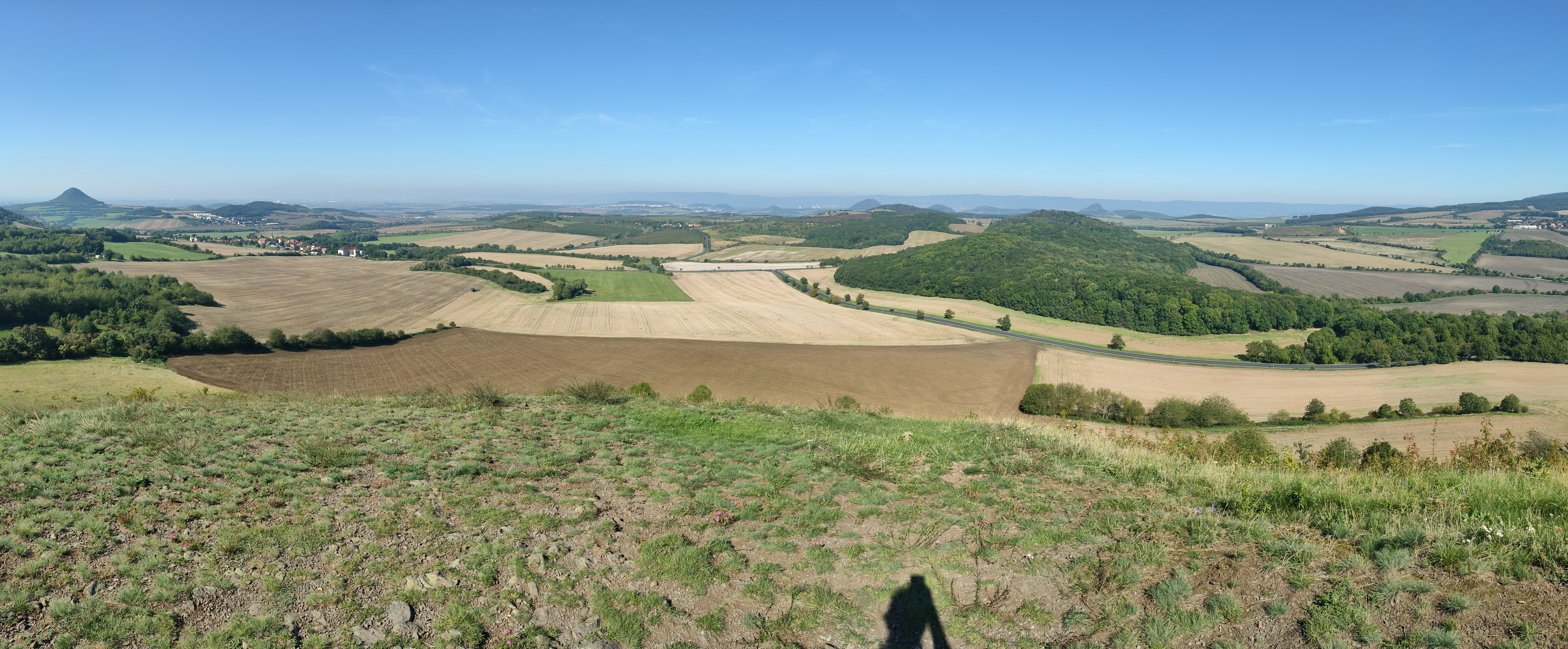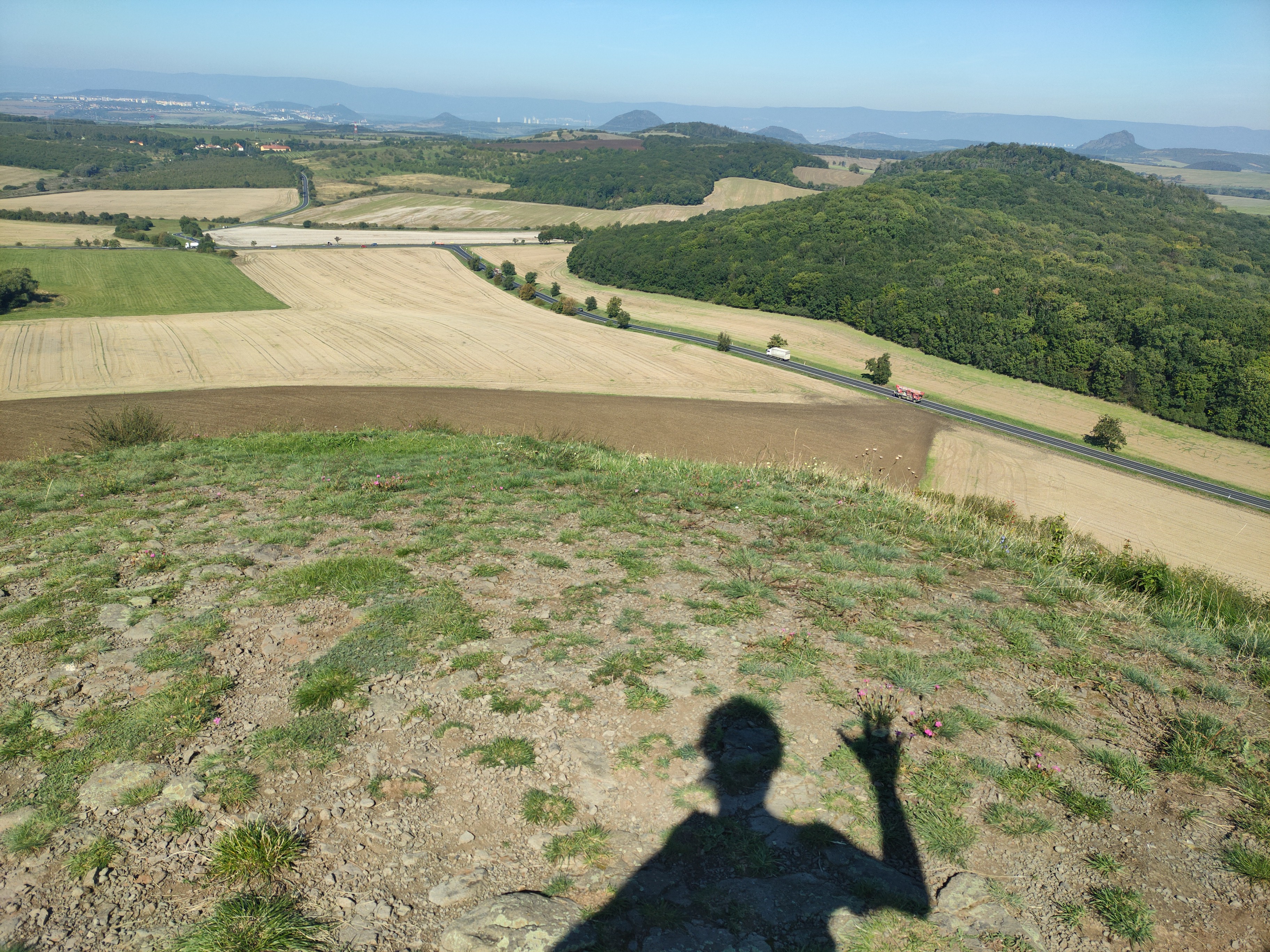 Snídám u kachního rybníčku a kachny mě ujišťují, že hruškový koláč taky rády, pár drobků házím do trávy a vyvolávám kachní rvačku. Louny projíždím přes náměstí podle navigace, není to moc značené. Mapy mě vedou do podezřelého průchodu se schody, vracím se a objíždím to jinudy. Na severní straně města je pěkná cyklostezka se stromořadím, po ní projíždím předměstím a odkláním se z plánované trasy na Červený vrch, kde má být vyhlídka. Míjím školní výlet směřující zjevně stejným směrem. Vyhlídka otvírá až od jedenácti, děti budou asi zklamané. Výhled tu není bez rozhledny žádný. Nahoře potkávám dva techniky, kteří sem vyjeli montovat něco na anténách.