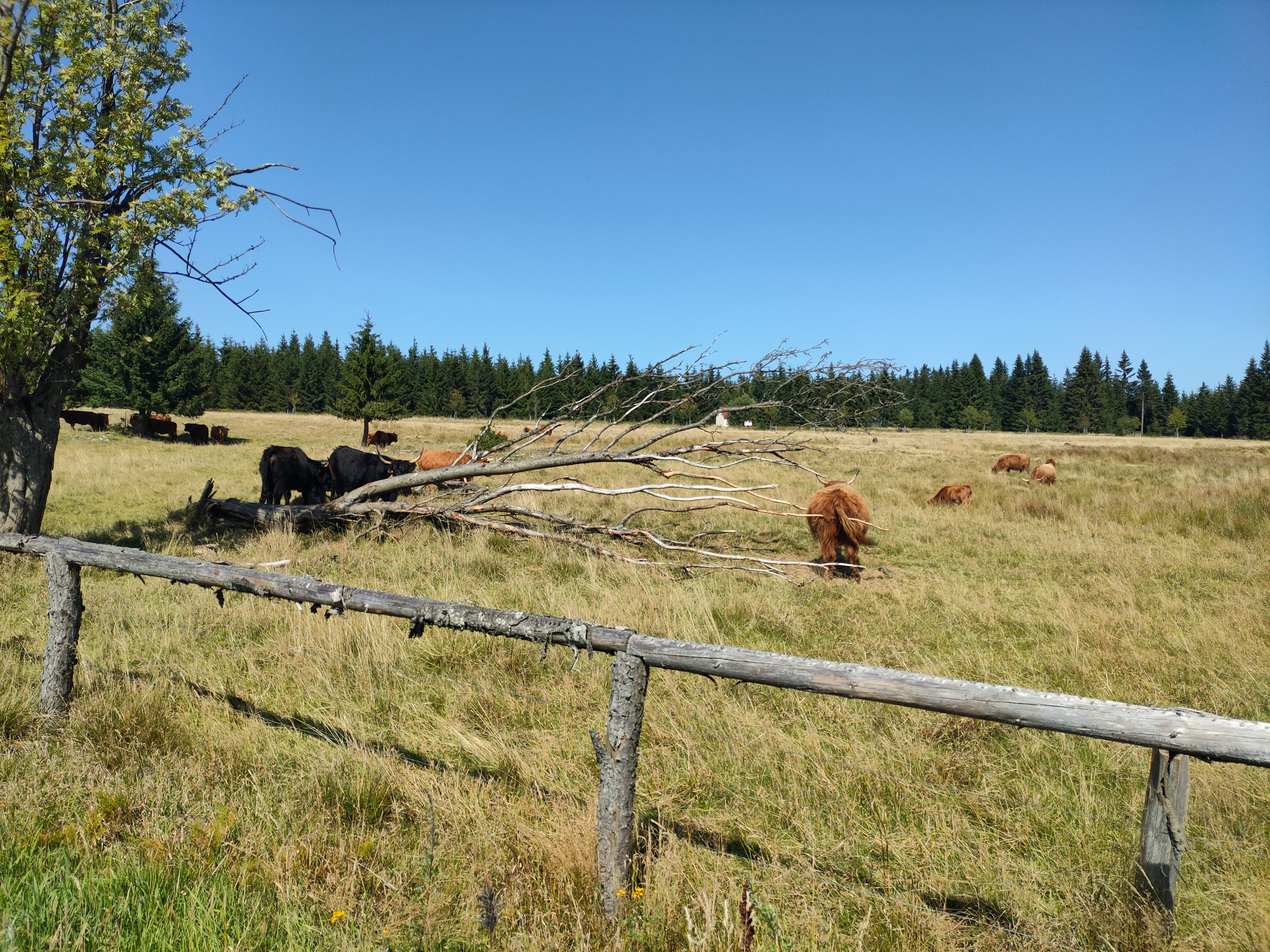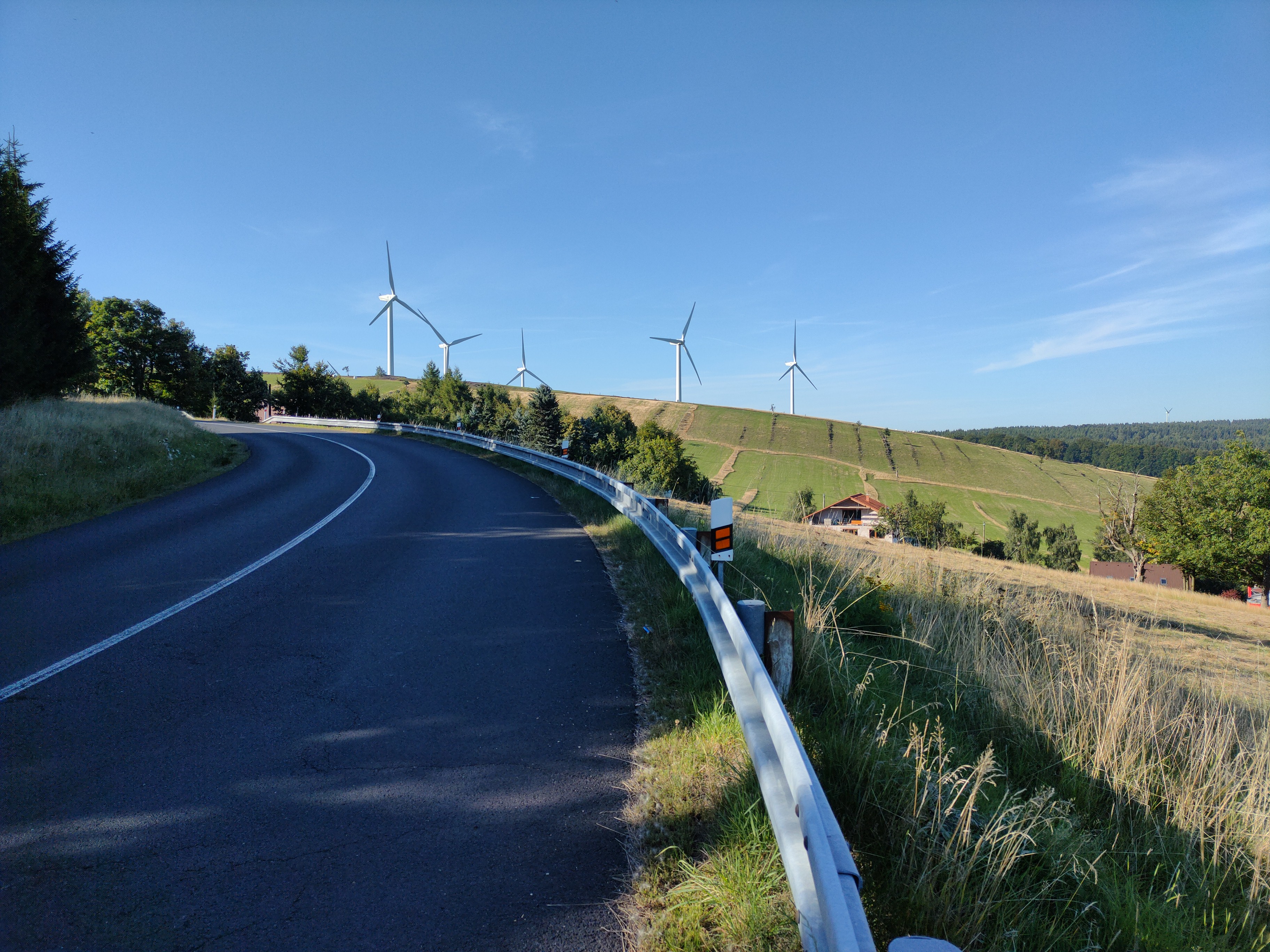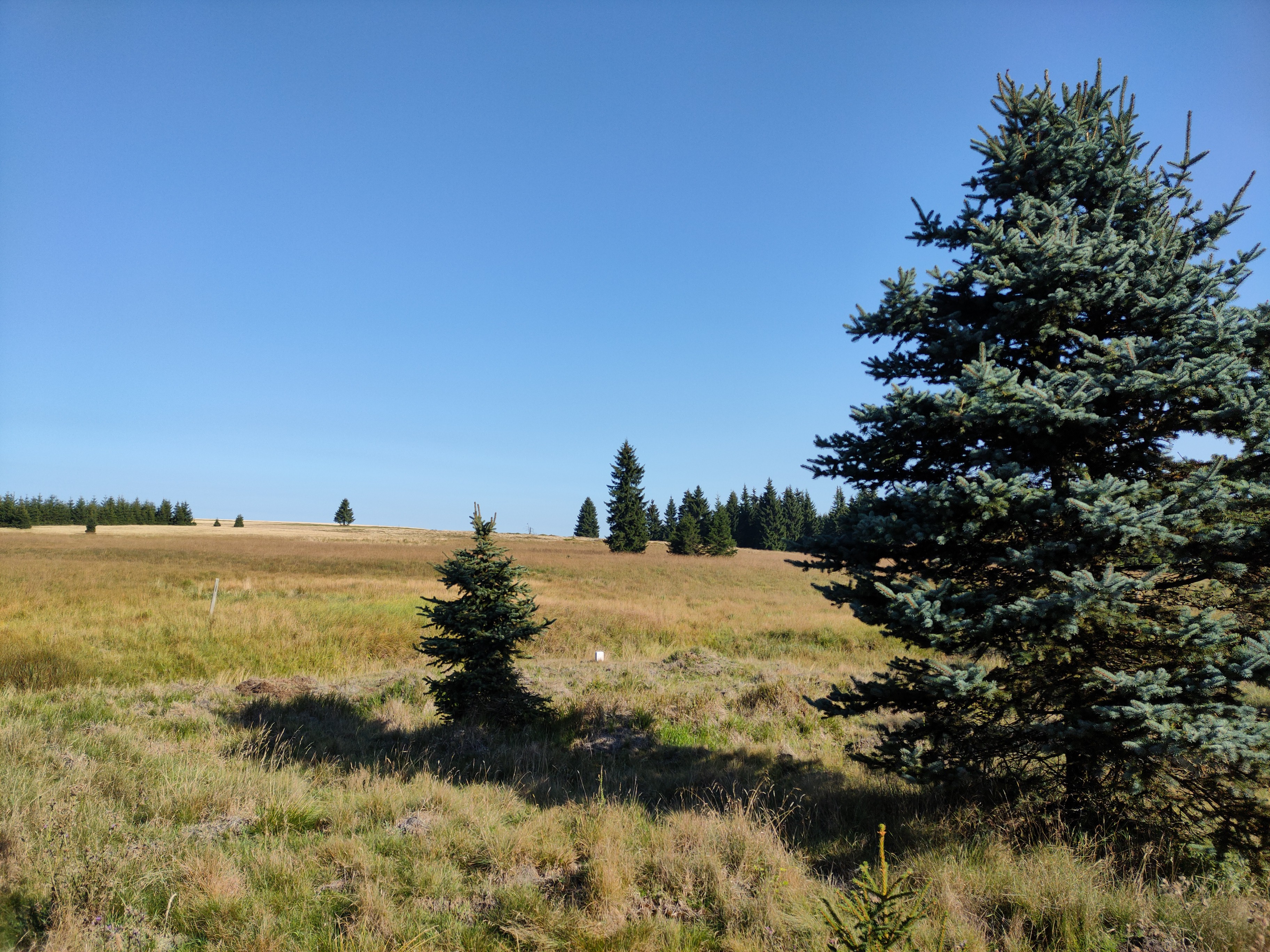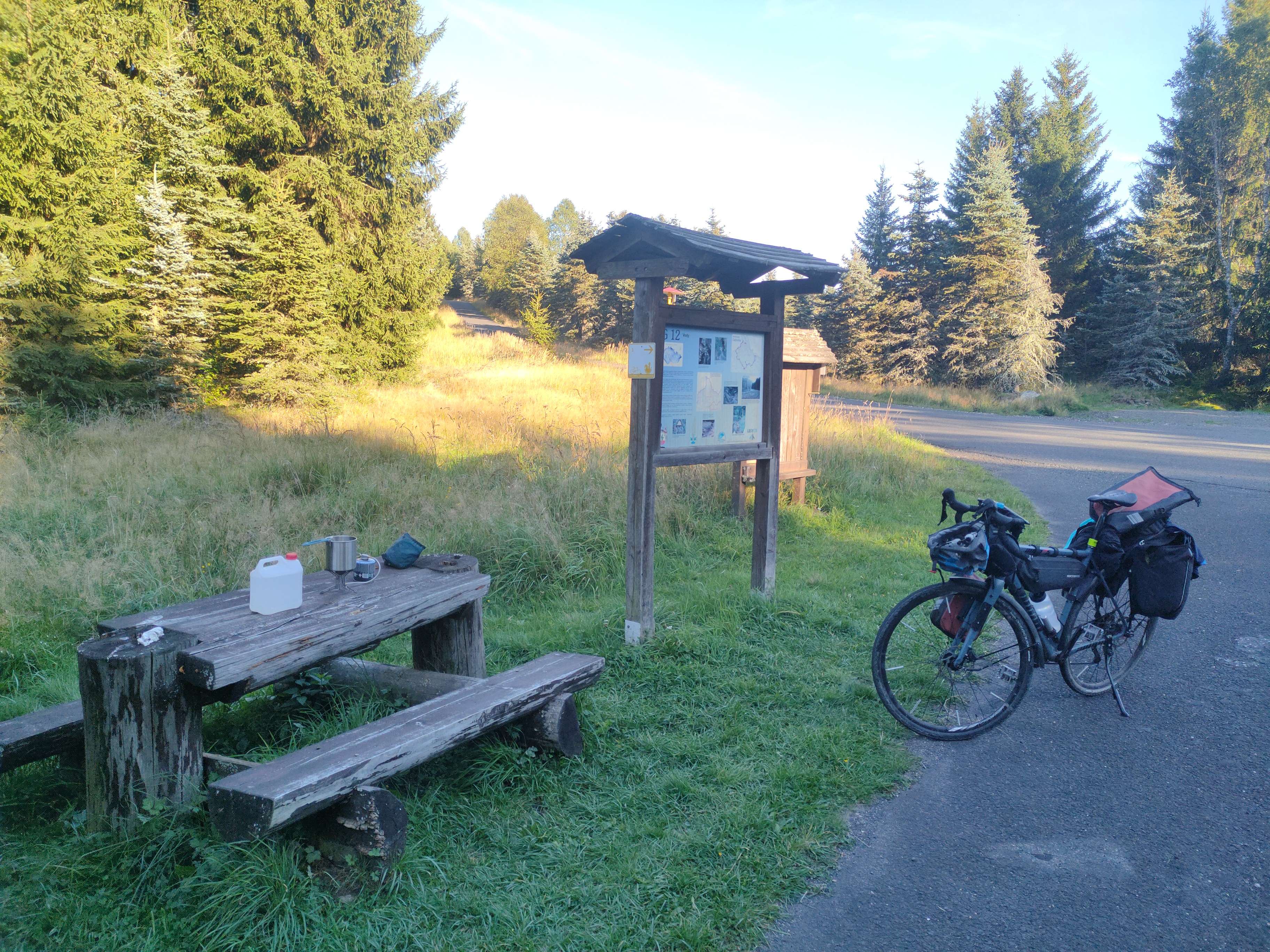Vařím si snídani u Červeného rybníka a vyrážím dál po hřebeni. Dnešním prvním cílem je Boží Dar, kam až dojedu zatím není jasné. Projíždím kolem nádrže Přísečnice, pěknou horskou krajinou s větrníky přes Měděnec, následuje pekelný výšlap na Klínovec. Na vrcholu jsem už byl a tak si to teď s chutí odpustím. Od odbočky k vysílači už se sjede rovnou na Božák.