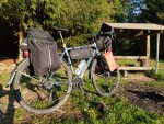 Kolo je Author Aura RX5, zadní brašny, nosič a držák spacáku na řidítka Topeak, brašna do rámu Rockbros (Čína) a brašny na vidlici Rhinowalk (taky Čína). Zámek jsem vezl jen malý lankový, s kilovým Abusem se mi teď nechtělo táhnout. Když kolo nechávám max před krámem, pro pocit to stačí.