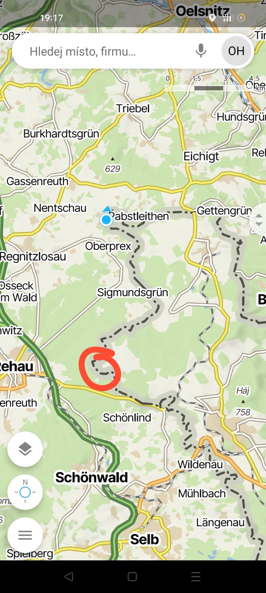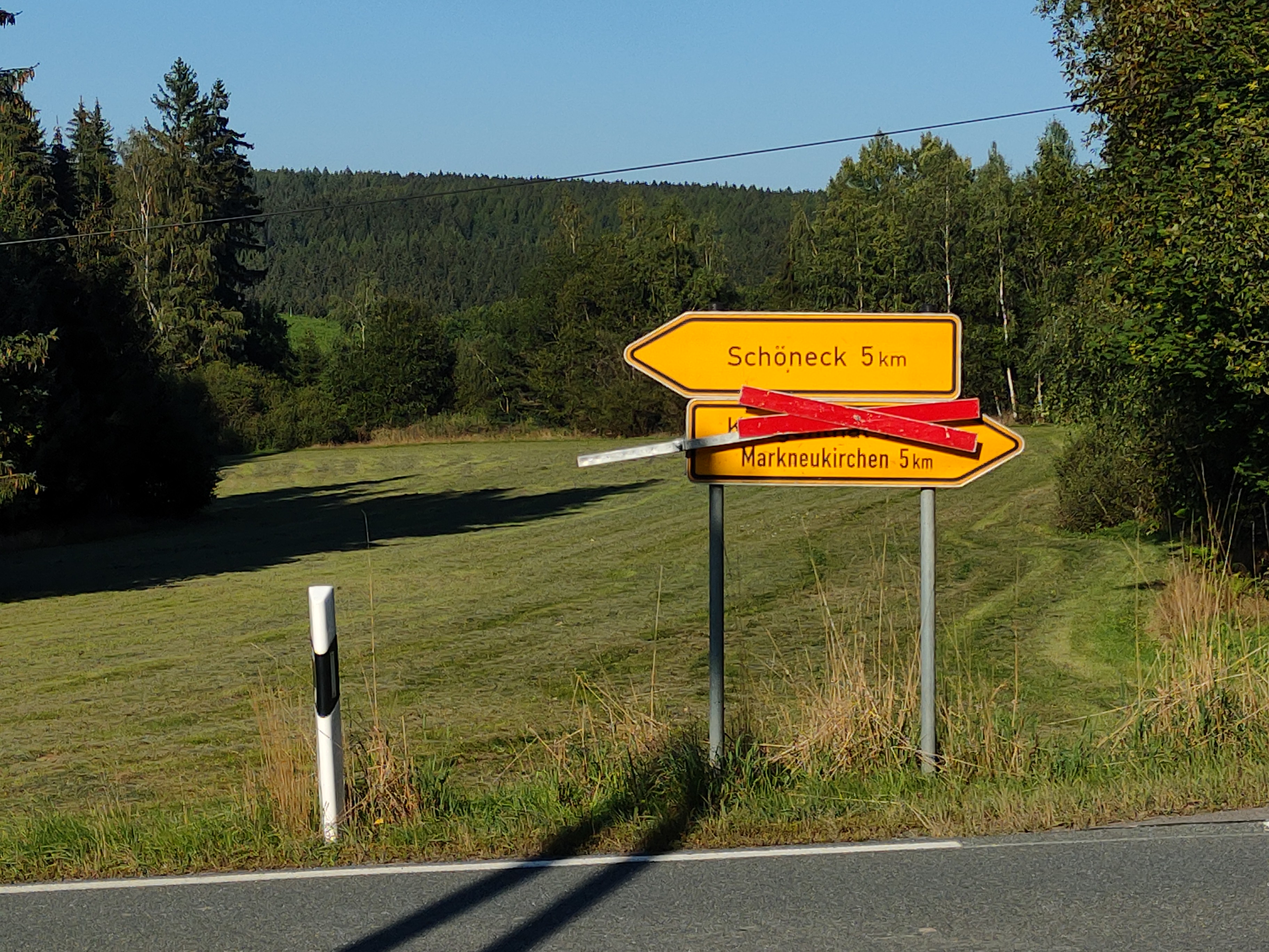 V Kraslicích se otáčím na sever a zbytek cesty na špičku republiky jedu Německem, kde to vychází kratší. Hraniční přechod tu není, ani jsem si nevšiml kde skončilo česko, tak nějak plynule cedule přechází do němčiny. Na české straně bylo všechno dvoujazyčné, u Němců ani náznak snahy.