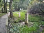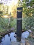 Nacházím odbočku k nejzápadnějšímu bodu, není tu kdovíjaké značení, mapy to jistí. Míjím dva týpky kteří zřejmě opravují (nebo kradou) kamenný pomník zaniklé obce, projíždím oblakem prachu a po loukách směrem ke hranici. Tady se pěšina mění v kozí stezku a tak zbytek cesty kolo střídavě vedu a nesu přes kořeny v močále. V přístřešku u hranice probouzím (je půl desáté) dalšího šílence s kolem, který tu přespával v hamace a vyráží na východ do Otrokovic. Ve srovnání s trojmezným bodem tu není o co stát, přístupová cesta je tristní a je tu pouze informační tabule a plechová značka v potoce. Geografická meta je ale dobyta a tak se můžu se vydat na zpáteční cestu do Prahy.