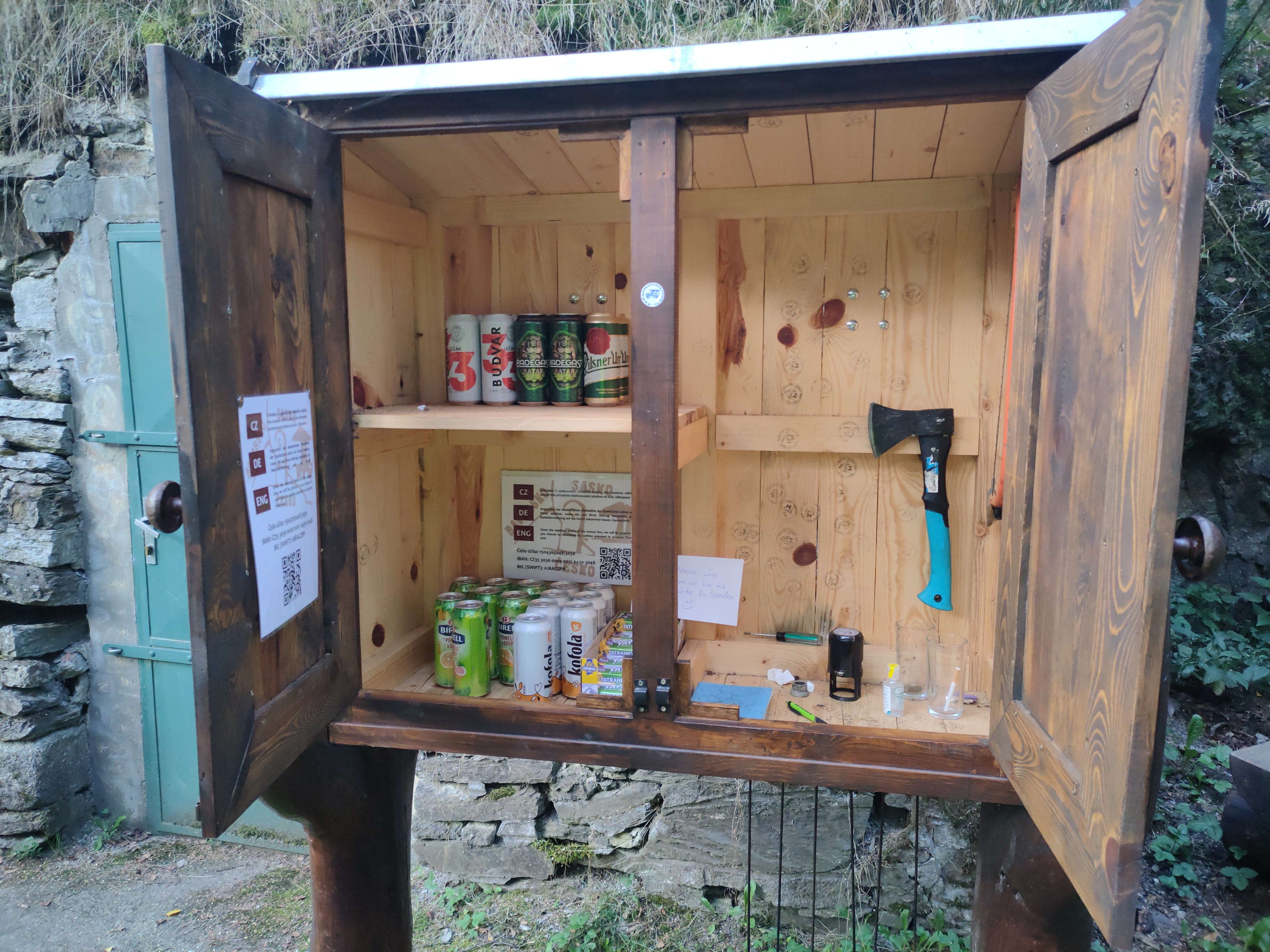 Na Božím Daru poobědvám v hospodě na náměstí. Řízek není, vlastně nic z tabule není, jen guláš a borůvkové knedlíky. Dávám si guláš. Pěkný domácí bramborový knedlík co vidím u německých turistů už taky není a dostávám čtyři trochu tuhé houskové knedlíky. Nekup to za tři stovky. Ale mám hlad a místní pivo z Rýžovny ujde. Ještě v Božím Daru zastavuji v koloniálu a doplňuji zásoby na cestu - dva moravské koláče k snídani, tři banány ve slevě, nějaké tyčky, nanuka a sáček lékorek. Zbytek dne a sobotu jedu hlavně na lékorky a banány.