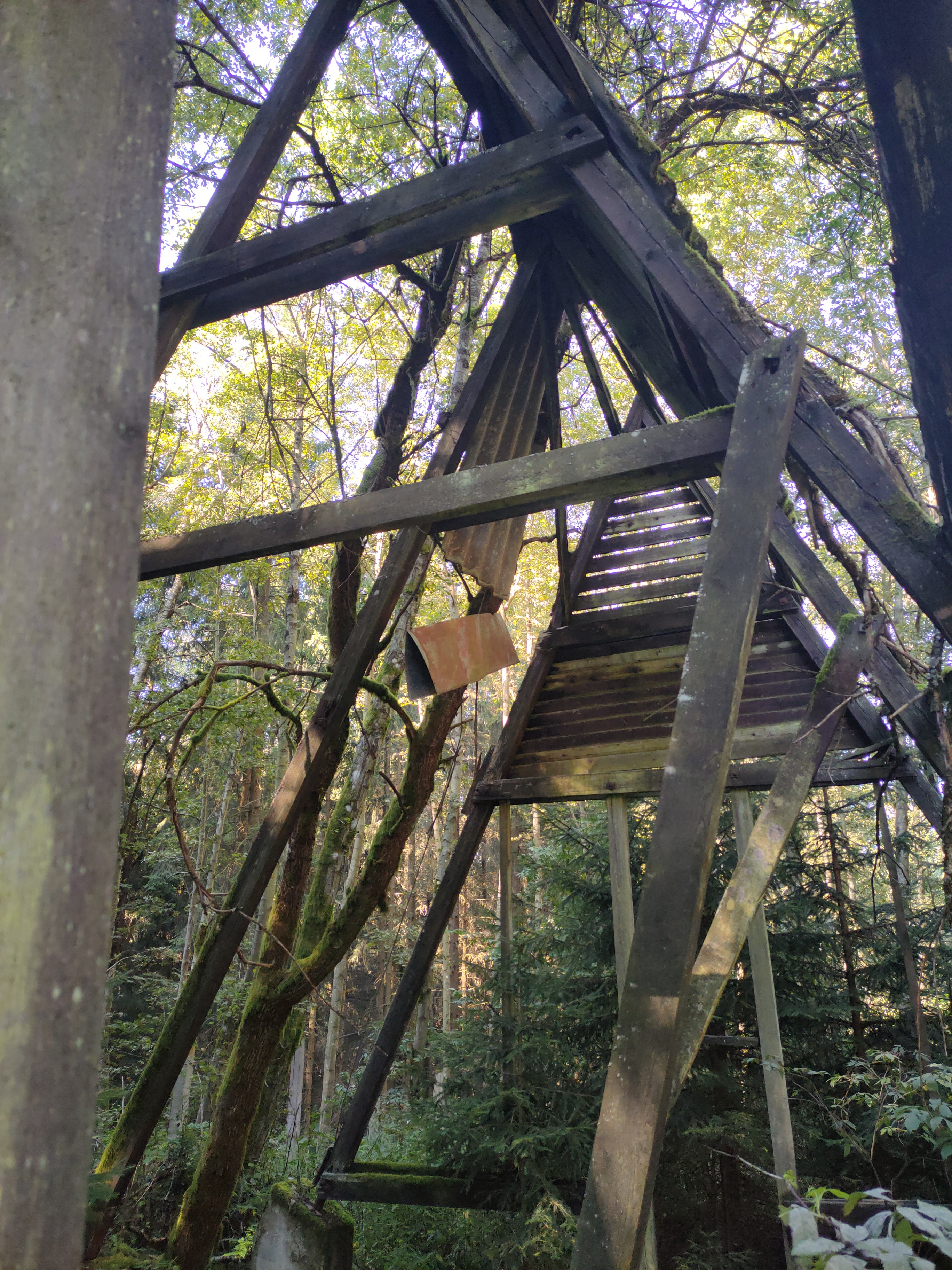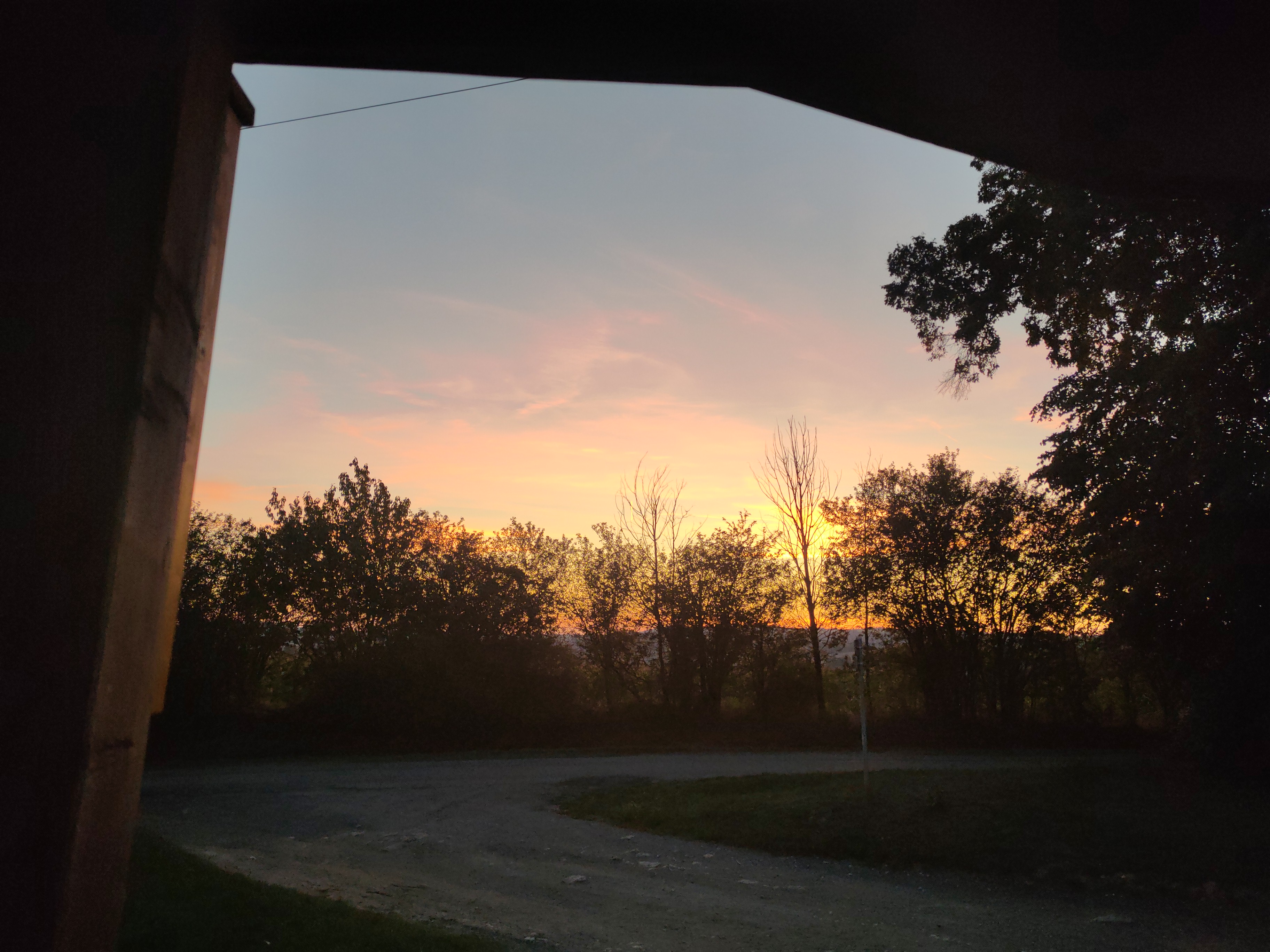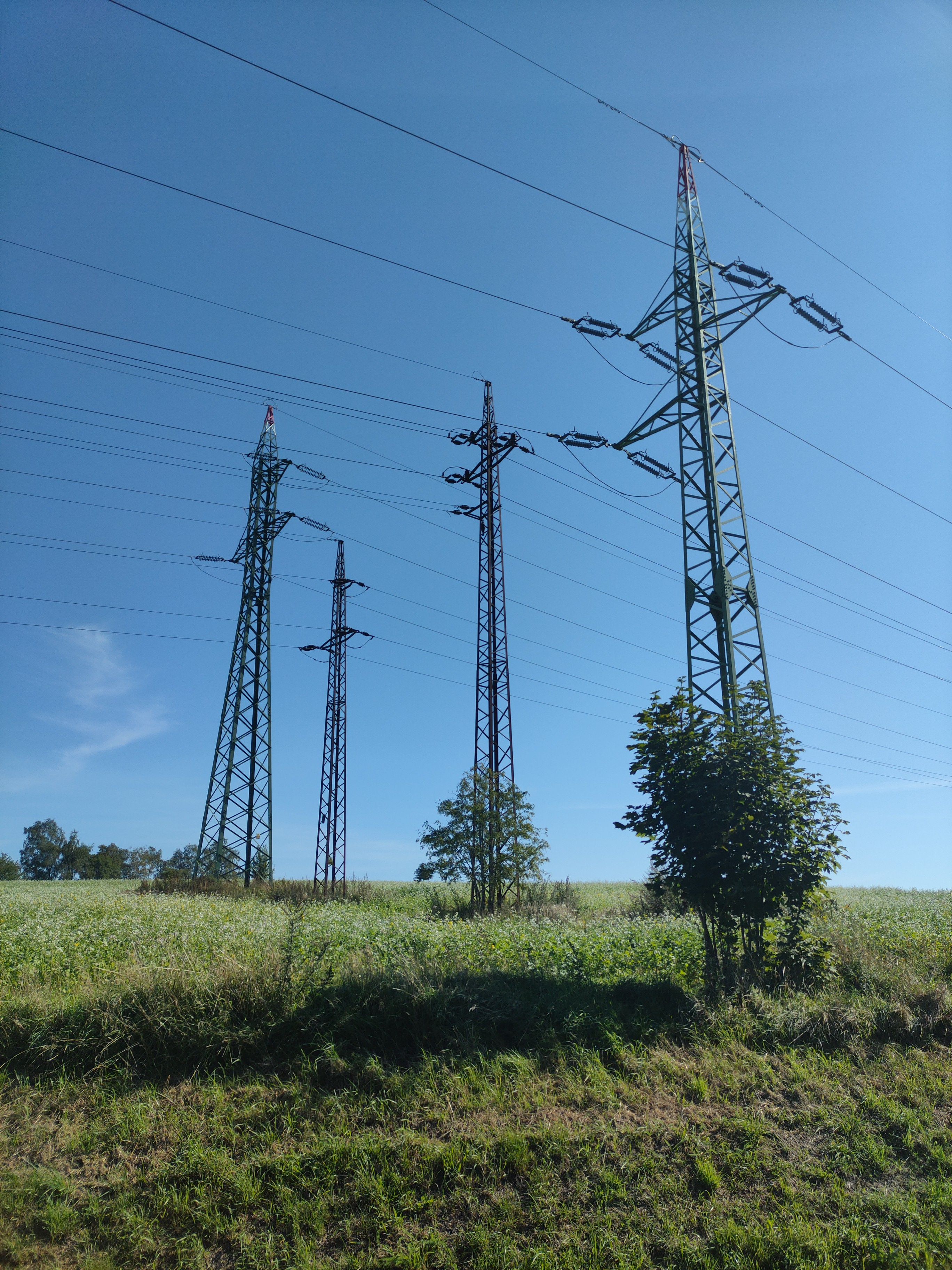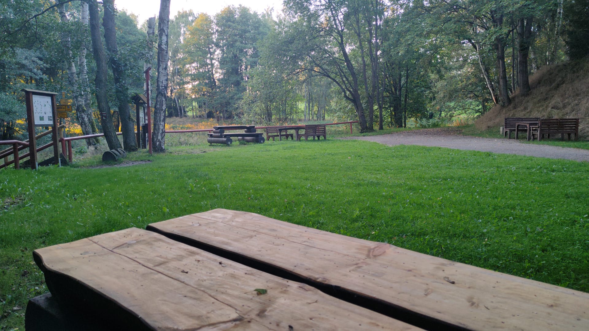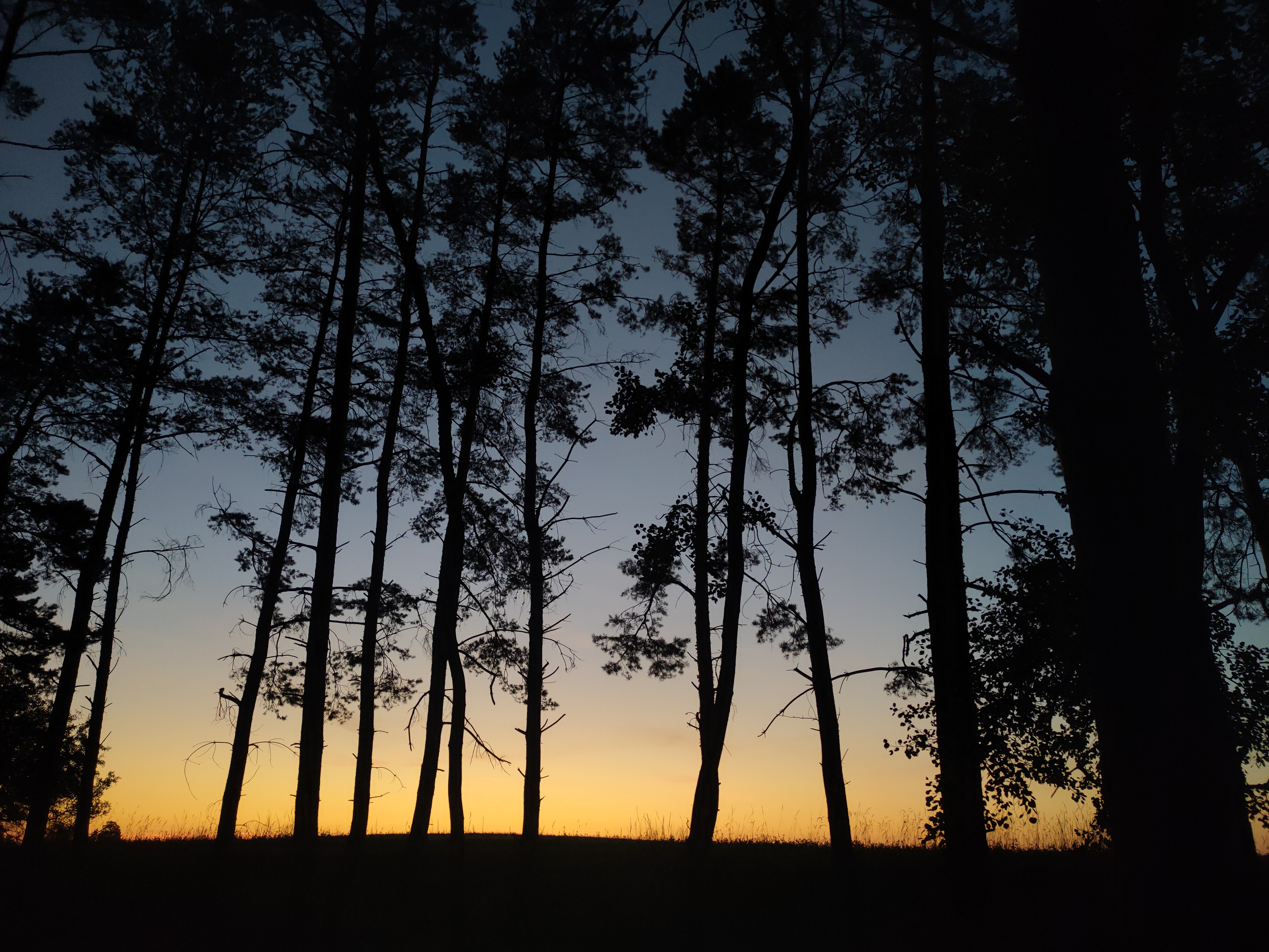 Už skoro za tmy přijíždím k cíli, ze západu. Trojmezný bod je z německé strany přístupný jen po pěšině a není tam nějaké zvláštní značení mimo samotný patník, snad jen informační tabule. Na české straně je krásný travnatý plácek (šel by tu postavit stan, ale stan nevezu) s lavičkami. Hlavně tu ale je samoobslužná prodejna tatranek, kofoly a piva. Tatranku s kofolou si kupuji QR kódem (kasičku někdo prý ukradl a tak už tu není?!) a vyrážím hledat místo na nocleh. Hamaku vážu mezi břízy na pastvině a poprvé zkouším spát bez plachty. Jsou vidět hvězdy! I když jen mezi korunami stromů a jen když nezatáhnu síťku proti komárům. V noci ale dost fouká a i s underquiltem je trochu chladno. Hamaka na vrcholu kopce asi nebyl úplně nejšťastnější nápad. Nocí se nese rytmické dunění, které pokládám za zvuky z větrných turbín, ale nejde to s jistotou určit. Během noci zvuk několikrát ustává a mění hlasitost. Na stromě vedle podle všeho bydlí sova. Únava ale je dostatečná (nechtěl jsem spát v Německu a tak to vyšlo asi na 120 km) a tak i přes noční zvuky a usínám.