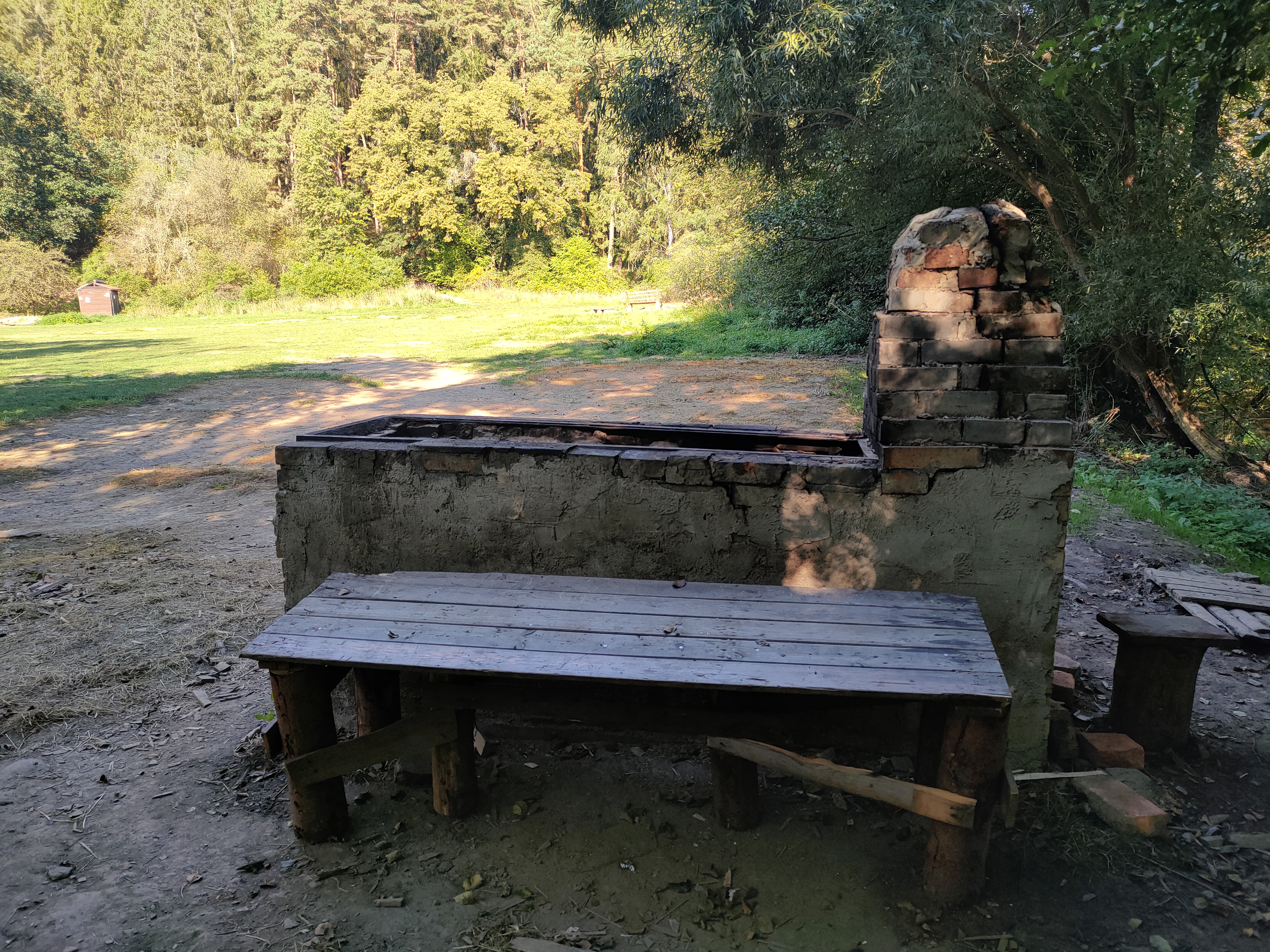 Jedu podle navigace a většinou po silnici, už není čas ani chuť na hrdinství. Za vsí Močidlec, kde aroma zcela odpovídalo názvu, míjím nejprve asi 5 policajtů na motrkách a pak několik Škodovek s cyklisty v závěsu, zřejmě nějaký závod, pěkná blbárna. V Rabštejně se držím cyklostezky Berounka-Střela, což určitě cestu nezrychlilo, ale bylo to tam pěkné. Projíždím přes opuštěné skautské tábořiště, brod, kolem starého lomu na břidlici a dlouhým stoupáním v lese k Černému rybníku. V Žihli si dávám nanuka, kupuji rohlíky k obědu a jedu dál po cyklostezce. V Ostrovci se cesta ztrácí, místní mě ale navigují na tu správnou pěšinu, zřejmě tady běžný problém. Nacházím další skautský tábor, kde ve studánce doplňuji vodu. Pramen je velmi slabý a tak zatímco se kanystr plní, obědvám druhý Rio Mare s rohlíky. Ze zvědavosti procházím skautské zázemí a nacházím pozoruhodnou sochu prasete z Ytongu. Asi trestná lavice za prasečiny u jídla?