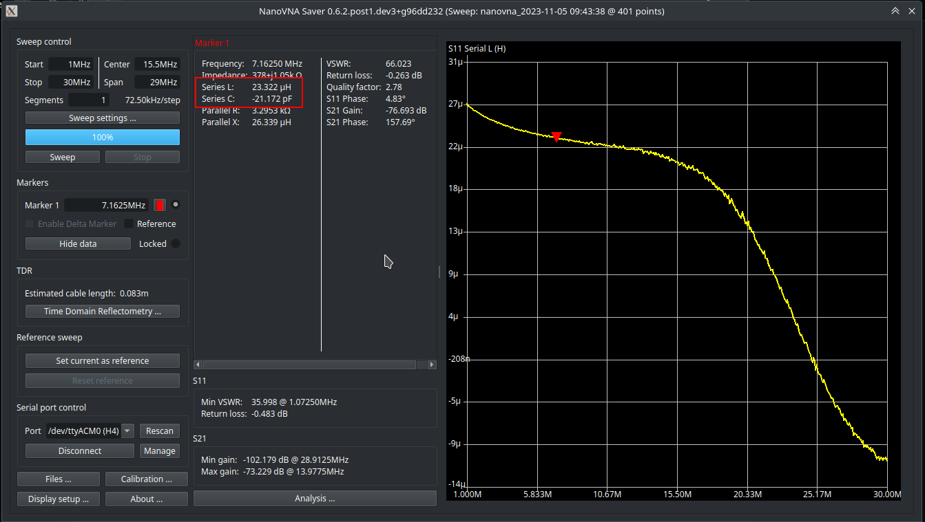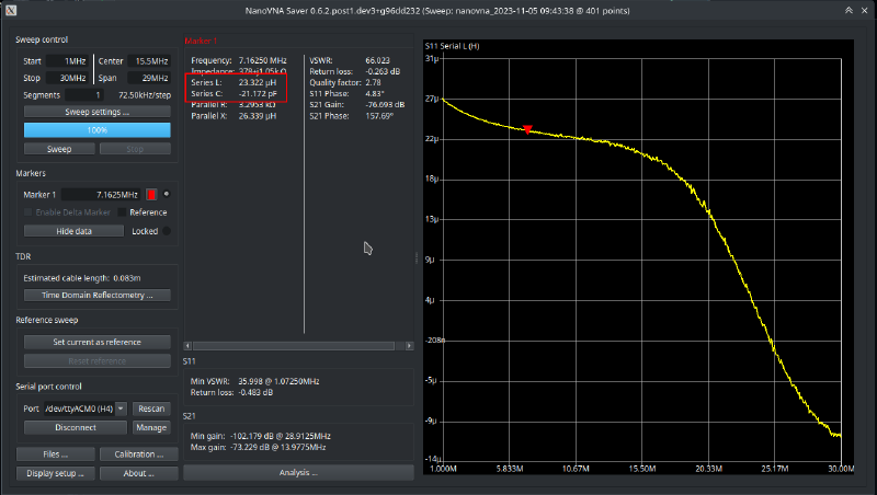Here’s an example measurement of a 23uH inductor (seen above in the screw adapter) that I wanted to use on the 40m band. It looks fine up to about 15 MHz, the rolloff is probably caused by the material in the ferrite ring, parasitic capacitance between windings, etc.